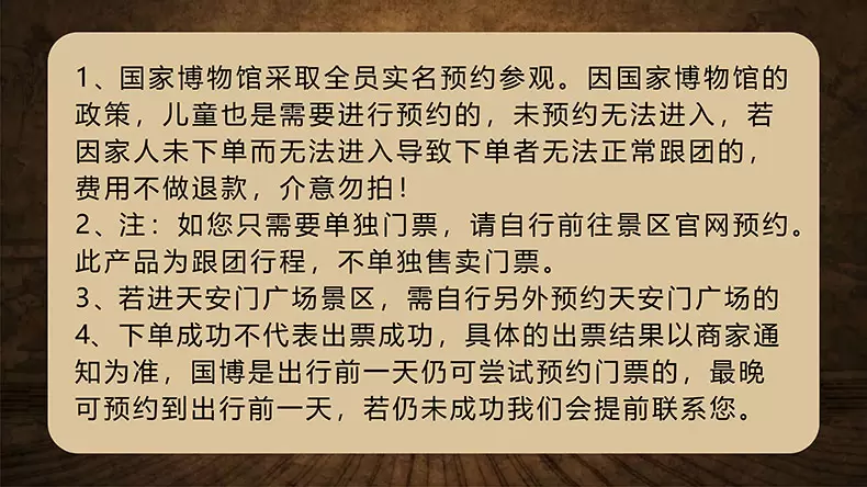 国家博物馆门票免费,此产品免费赠预约,不保证一定预约成功,国博提前7天开售,我们会尽全力给您预约。因确认时长不能覆盖抢票时间,订单确认成功不代表预约成功,请耐心等待商家通知,如果您在此期间着急查询预约结果,您可以在抢票日的后天14:00后咨询商家客服或打电话查看您的情况,若您不着急查询,预约情况我们默认至少提前2天告知,预约不到门票可以全款退,介意者勿拍!!预约到的客人我们提前一天22:00前会与您取得联系,如未联系您可找平台客服或致电。