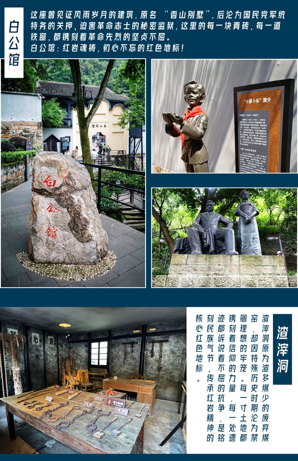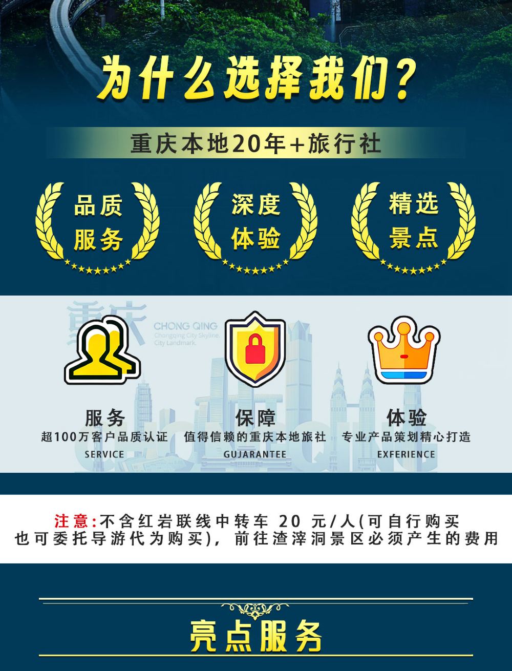 ①不含红岩联线中转车 20 元/人(可自行购买也可委托导游代为购买),前往渣滓洞景区必须产生的费用。红色旅游景区内根据政策规定不允许导游讲解,因此客人需要讲解可自行找景区内专业的讲解员讲解。
