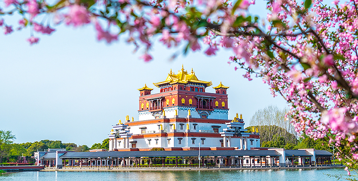 五印坛城矗立于碧波荡漾的香水海之中,城内饰圣洁而绚丽,完美融合了彩绘、壁画、木雕、唐卡、壁饰、镀金等藏族装饰技艺,美轮美奂地展示了独特的坛城艺术。