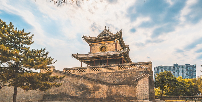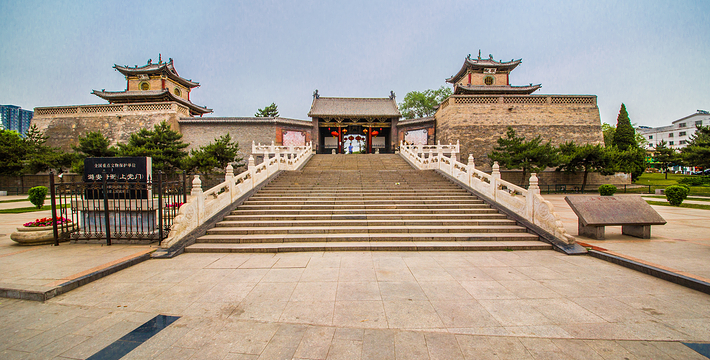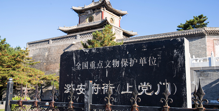上党门是长治的象征和标志。它位于长治市区中心府坡街北端的高岗上,是古代上党郡署的大门。上党门始建于隋朝开皇年间(约公元581年至600年)。它的门楼海拔1500米,与太行山的山顶齐高,十分雄伟壮观。 唐玄宋李隆基在隋朝建筑的基础上,对上党门进行装 饰,并在附近修建了梳妆楼、看花楼、德风亭等建筑,*后增修了飞龙宫、圣瑞阉、望云轩等。北宋靖康年间,金兵大举南下,上党门毁于兵火之中。现在的上党门是明代重建的。上党门坐北朝南,居高临下,挺拔独立。门为重檐歇山式结构,大门左侧建有钟楼,右侧建有鼓楼, 钟鼓楼一曰“风驰”,一曰“云动”。意思是说建筑在上党的上党门高耸天外。两楼台基高峙、平行排列,遥相映衬。楼高门低,高低错落,主从分别,充分反映了封建官府的威严,极富民族风格。上党门作为省级文物重点保护单位,近年来得到了多次维修和彩画。登上门楼远眺,上党古城景色历历在目,远山近水尽收眼底。