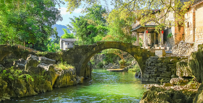一溪流水贯穿于小镇,水面上有突凸的石块,形成一座特别的桥梁,便是黄姚独特的“跳桥”,过桥的人需跳跃着一步一跳地跳到对岸。