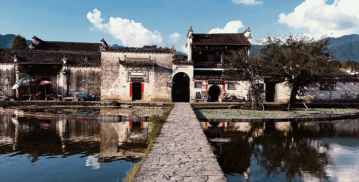 在黟县乘坐开往宏村的公交车,2元/人,15分钟即可到达。