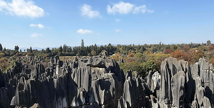 石林是一座名副其实的由岩石组成的“森林”,穿行其间,但见怪石林立,突兀峥嵘,姿态各异。由于石灰岩的作用,石柱彼此分离,又经过常年的风雨侵蚀,无数的石峰、石柱、石笋、石芽、形成了集奇石、瀑布、湖泊、溶洞、峰丛和丘陵于一身而显得千姿百态的石林。云南石林喀斯特无论是类型分布的多样性、溶岩发育的独特性、地质演化的复杂性、岩石机理的美学性还是人文风情的融合性、入内观赏的通达性等等方面,与北京故宫、西安兵马俑、桂林山水齐名,成为中国四大旅游胜地之一。石林风景区的开发始于70余年前,由大石林、小石林、万年灵芝、李子园箐、步哨山、乃古石林6个片区组成。形态奇特的剑状、蘑菇状、塔状、柱状、城堡状、石芽、原野等,拟人似物,栩栩如生的石林,或隐于洼地,或漫布盆地、山坡、旷野,或奇悬幽险,亭亭玉立。云南石林,以其独特的民族风情令人陶醉。在石林多彩的红土地上、——彝族撒尼人。他们在奇峰异石间和彩云深处创造了阿诗玛文化和欢乐的歌舞,他们祭祀、劳作、相爱、狂欢,每时每刻都创造着与石林一样众人惊奇、感动的艺术和诗意。
