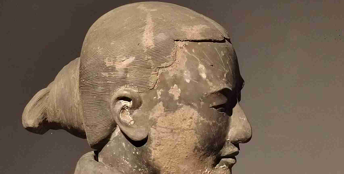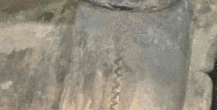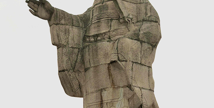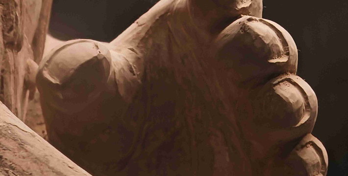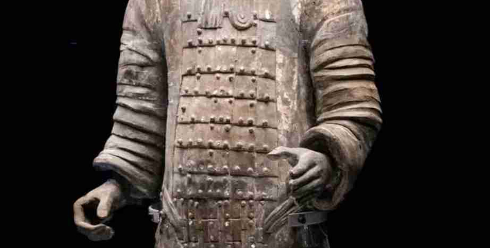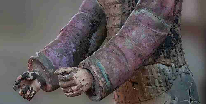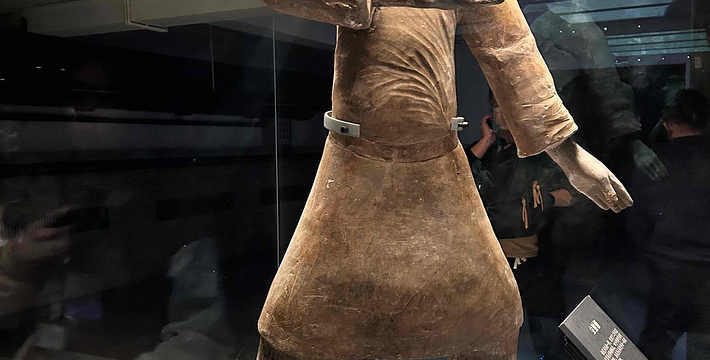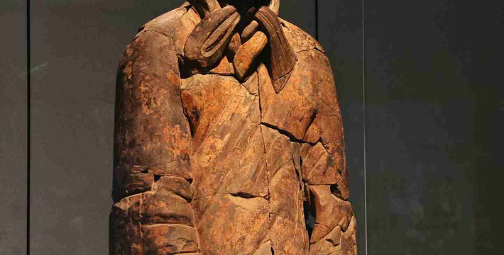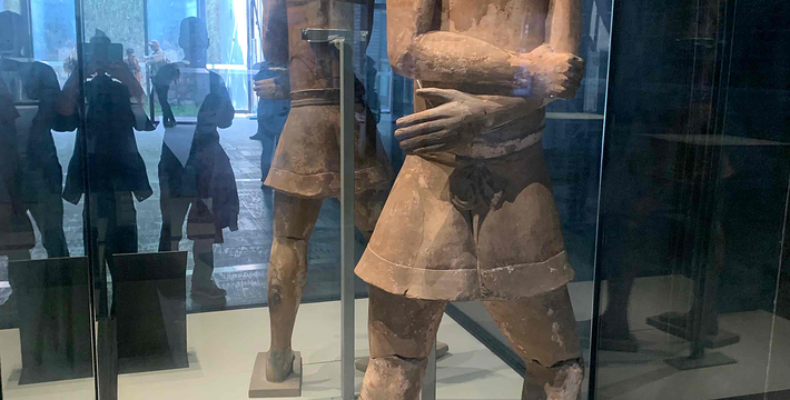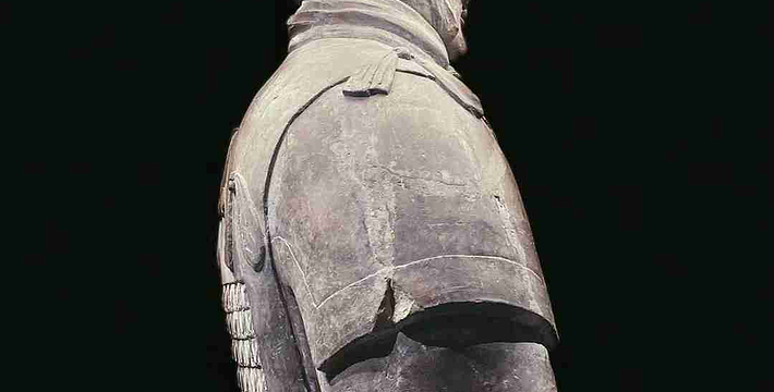 跪射俑出土于二号坑东部,在其雕塑艺术中,有一点非常可贵,那就是他们的鞋底,疏密有致的针脚被工匠细致地刻画出来,反映出极其严格的写实精神。