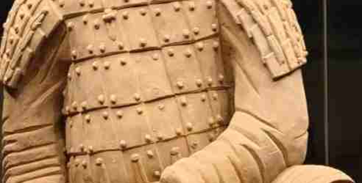 跪射俑出土于二号坑东部,在其雕塑艺术中,有一点非常可贵,那就是他们的鞋底,疏密有致的针脚被工匠细致地刻画出来,反映出极其严格的写实精神。