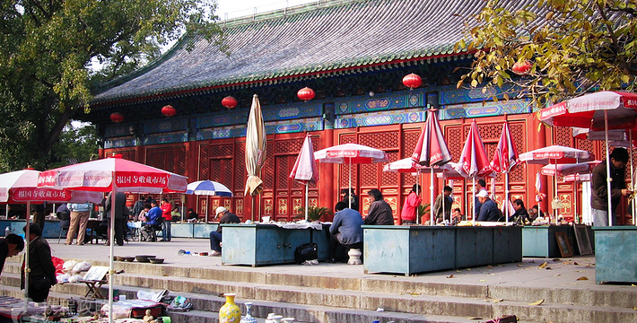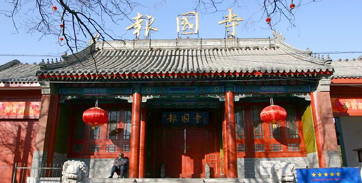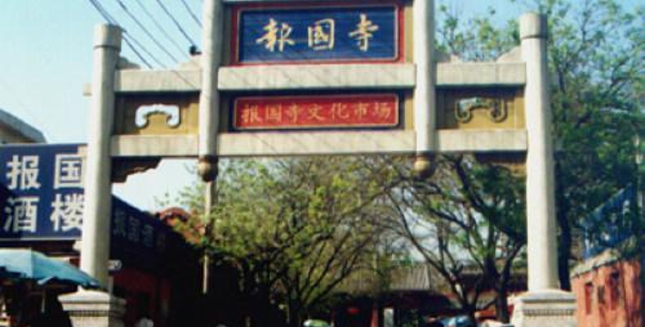 报国寺占地17000平方米。始建于辽,明初塌毁。成化二年(1466)重修,改名慈仁寺,俗称报国寺。清乾隆十九年(1754)重修,改名大报国慈仁寺。报国寺有七进院落,七层殿堂,堂后为36级高的毗卢阁。阁下有瓷观音像高尺余,宝冠绿帔,手捧一梵字轮,系神宗时景德镇瓷窑所贡献,为旧京八宝之一,谓之窑变观音,梁间曾悬《胜果妙因图》1轴。寺内还有嘉庆六年(1801)《五彩天尊仙女》1轴。现寺中仍保存成化二年(1466)御制碑,和乾隆二十一年(1756)御制重修报国寺诗碑。当年登上毗卢阁,可览京城风景,此寺规模宏大。思想家顾炎武在京时,曾住寺院西院,道光二十二年(1843年)改建西院为顾亭林祠。