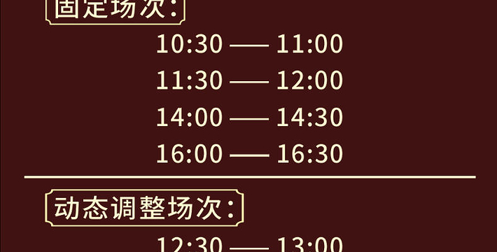 园内落梅轩演出厅票价由原价50元/人降为30元/人。(根据防控要求,落梅轩演出厅的演出时间由每天六场调整为每天四场,每场由30分钟调整为20分钟。)