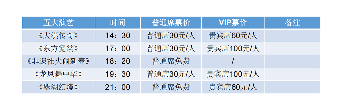 《龙凤舞中华》:每天19:00表演。普通席免费(法定节假日:20元/人),贵宾席:50元/人(仅35个座位),