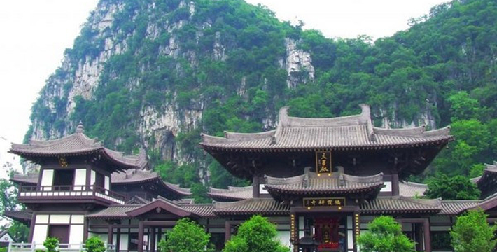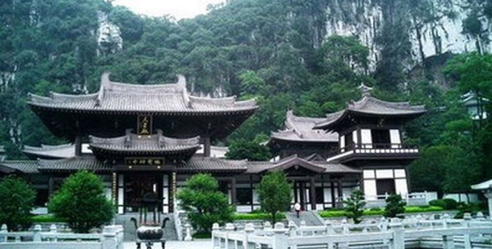 座落于桂林七星景区内普陀山西麓的栖霞禅寺,缘起隋代高僧昙迁云游桂林后所题的 “栖霞洞”,寺庙始建于唐朝。武宗会昌年间诏令毁佛,栖霞禅寺未能幸免,元朝17年,道士唐大淳重建为全真观,明朝历万年间改为寿佛庵。清顺治8年,楚僧浑融耗时33年,四方募化,在寿佛庵基础上恢复栖霞寺,并使之成为西南佛教一大名刹,之后有清、民名宿感于栖霞寺盛名多次加修,战争期间再次严重受损。在众多名士的倡议下,栖霞寺根据历史记载规模在原址再次进行修复扩建,设天王殿、大雄殿、观音殿、藏经阁,中轴北翼借用江南造园手法,设曲廊、白莲池、素食斋、方丈院、听月亭。寺内精美的唐式佛像、名贵的东阳木雕,再现“栖霞真境”胜景。