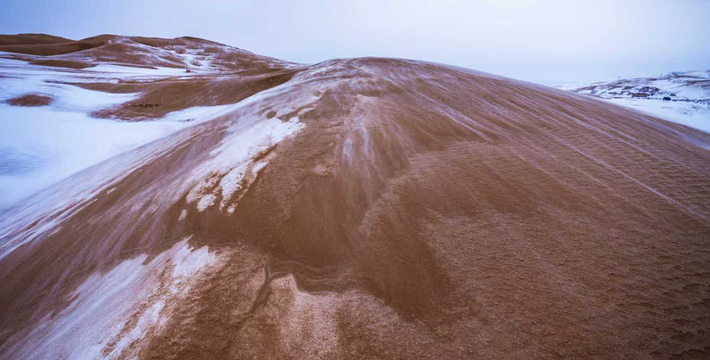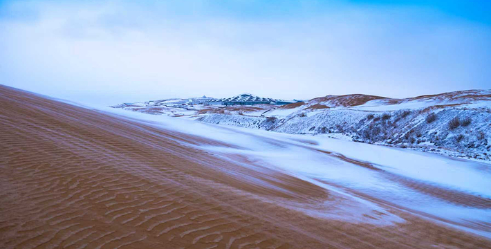 响沙湾在蒙语中被称为“布热芒哈”,意思是“带喇叭的沙丘”。它坐落在内蒙古达拉特旗境内库布其沙漠东端,北距草原钢城50公里,高大的沙丘呈月牙形状约有80多米高,横亘数公里,金黄色的沙坡掩映在蓝天白云下,有一种茫茫沙海入云天的壮丽景象,好似一条金黄色的卧龙。响沙湾居中国各响沙之首,被称为“响沙之王”。响沙湾沙高110米,宽400米,依着滚滚沙丘,面临大川,背风向阳坡,地形呈月牙形分布,坡度为45度角倾斜,形成一个巨大的沙丘回音壁。沙子干燥时,游客攀着软梯,或乘坐缆车登上“银肯”沙丘顶,往下滑溜,沙丘会发出轰隆声,轻则如青蛙“呱呱”的叫声,重则像汽车、飞机轰鸣,又如惊雷贯耳,更像一曲激昂澎湃的交响乐。响沙湾的沙漠面积约有1.6万平方公里,沙坡斜度约50°,其上没有任何的植被覆盖,从沙丘的顶部向下滑会响起“嗡嗡”之声。