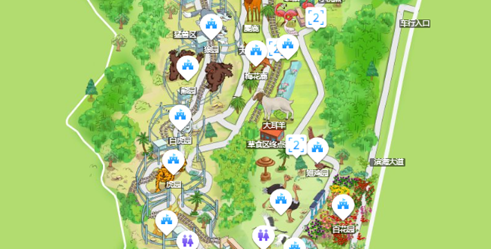 非洲风情园主要有:长颈鹿、斑马、角马、羚羊等;长颈鹿是是长颈鹿科长颈鹿属的一种生长在非洲的反刍偶蹄动物,它们是世界上现存最高的陆生动物。站立时由头至脚可达6-8米,体重约700千克。