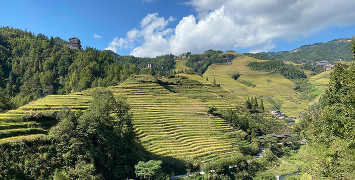 观景台上可以看到层层的梯田似千层楼梯一样直砌云端。一层层梯田似一道道鳞片,把一座连绵峻峭的龙脊山装点成一条活灵活现通体闪光的巨龙。