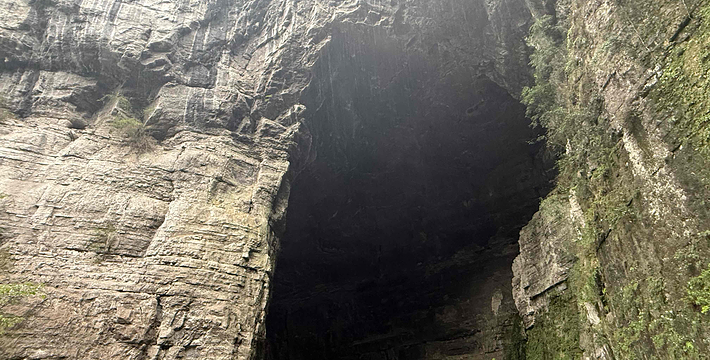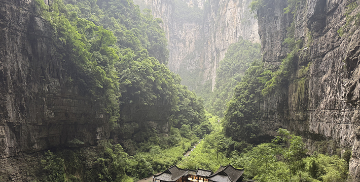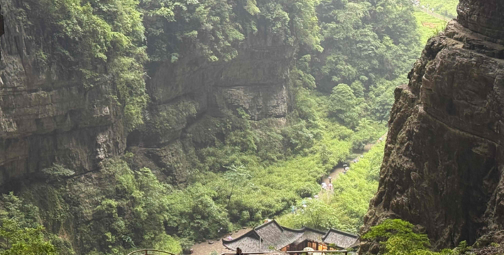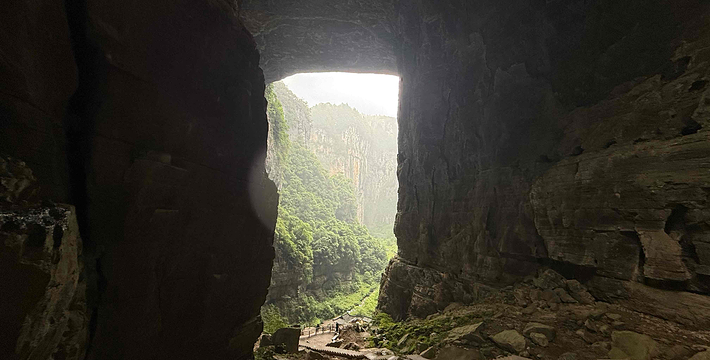 顺着长长的电梯深入谷地,武隆天生三桥奇峰俊秀美景尽收眼底。