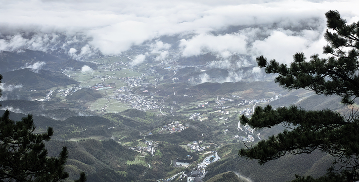 在金黄色的阳光照耀下,山下的民居在雾气迷茫中显现,让人有种飘然若仙的感觉。