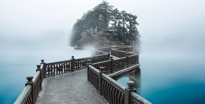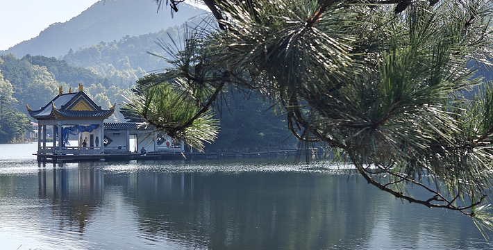 如琴湖座落西谷,峰岭围抱,森林蓊蔚,环境幽雅。湖心立岛,岛内有许多人工饲养的孔雀,所以名为 孔雀岛,曲桥连接,上缀水榭,形成绿水青山,相映成趣。