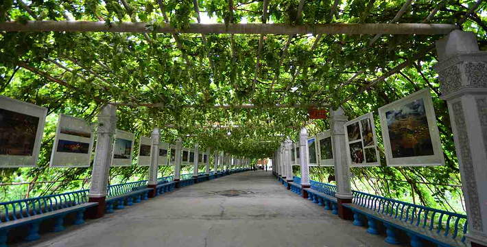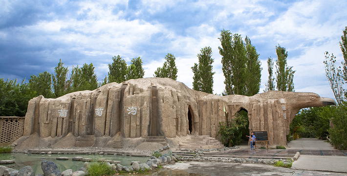 葡萄沟风景区位于吐鲁番市东北7公里处,南北走向,横穿火焰山,沟长8公里2公里,海拔高度300米,景区面积26平方公里,沟内流水潺潺,瓜果飘香,凉爽宜人,是吐鲁番旅游避暑胜地的好去处。景区主要游览项目有:葡萄博物馆、千泪泉瀑布、民俗馆、巴依豪宅、古衙门办公点等。主要经营项目有:西部酒域、瓜果品尝点、民族风味餐厅等;娱乐项目有:民族歌舞表演、达瓦孜高空表演等。目前景区主要居住着维吾尔、回、汉三个民族共计约1万人。主要以葡萄种植和葡萄干晾为主,耕地面积7400亩。风景秀丽的葡萄沟,以盛产优质葡萄闻名中外。这里主要种植无核白葡萄,还有马奶子、红葡萄、喀什哈尔、日加干、琐琐等13个品种,潺潺流水声给葡萄沟增添了青春的活力。两面山坡上,梯田层层叠叠,葡萄园连成一片,到处郁郁葱葱,犹如绿色的海洋。在这绿色的海洋中,点缀着桃、杏、梨、桑、苹果、石榴、无花果等各种果树,一幢幢粉墙朗窗的农舍掩映在浓郁的林荫之中,一座座晾制葡萄干的“荫房”排列在山坡下、农家庭院上,别具特色。夏天,沟里风景优美,凉风习习,是火洲避暑的天堂,旅游季节,中外宾客,川流不息,络绎不绝。