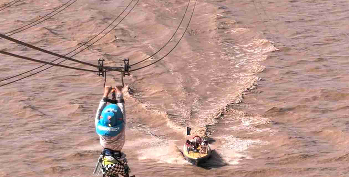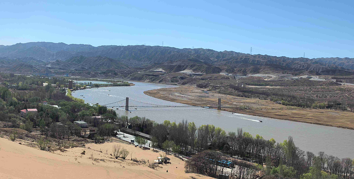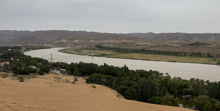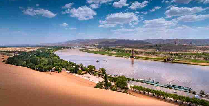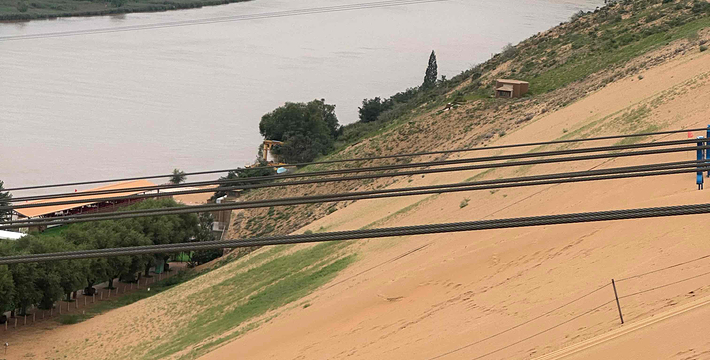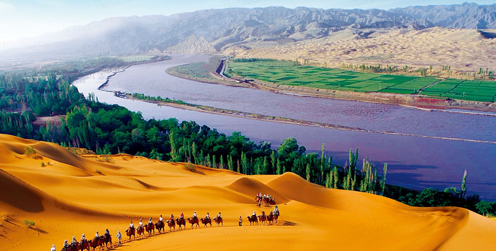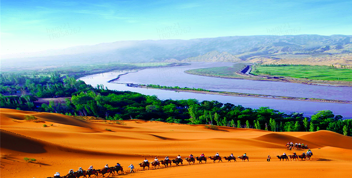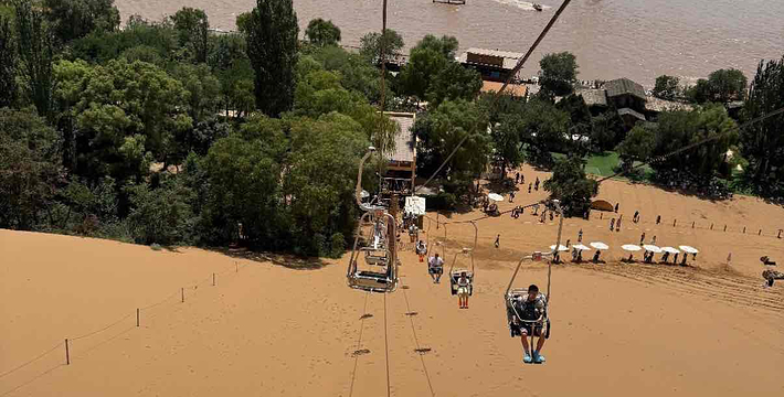 沙坡头旅游景区位于宁夏中卫市城西16公里处,是宁、蒙、甘三省(区)的交界处,也是欧亚大通道,古丝绸之路的必经之地。景区南靠山峦叠嶂、巍峨雄奇的祁连山余脉香山,北连沙峰林立、绵延万里的腾格里大沙漠,中间被奔腾而下,一泻千里的黄河横穿而过。沙与河这对本不相融的矛盾体,在沙坡头却被大自然的鬼斧神工巧妙地撮合在了一起,沙堤高耸,河水奔流,沙为河骨,河为沙魂,相依相偎,和谐共处,沙、山、河、园交相荟萃,似抒情诗,如风情画。