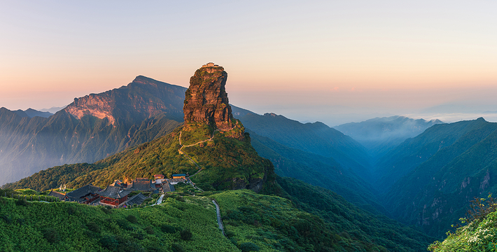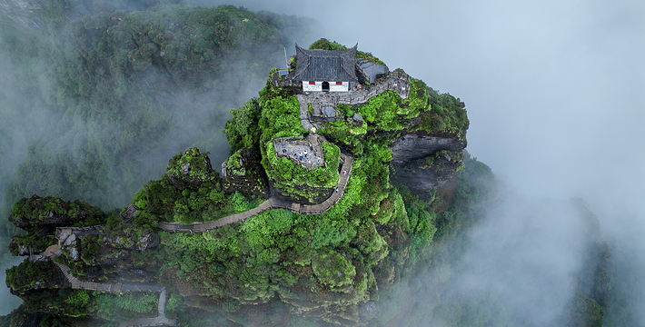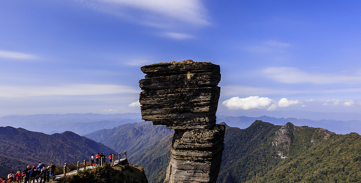 梵净山是武陵山脉的主峰,海拨2572米,总面积约567平方公里,古老的地层和优良的生态环境,使独特的风光,蘑菇石、金顶、黔金丝猴,莫不是“独一无二,惊世骇俗”。梵净山亦是中国五大佛教圣地。自古以来,以弥勒道场梵净山而与文殊道场五台山、地藏王道场九华山、普贤道场峨眉山、观音道场普陀山而齐名。这里留下了10至14亿年前形成的奇特地貌景观:孤峰突兀,断崖陡绝,沟谷深邃,瀑流跌宕,亿万斯年的风雨侵蚀,雕琢了老金顶附近的高山石林峰群,诸如“蘑菇石”、“老鹰岩”、“万卷书”、“将军头”等,鬼斧神工,惟妙惟肖,妙趣天成。新金顶更是孤峰高耸,直刺云天,金刀峡将新金顶从峰顶至山腰劈为两半,唯有一线峡谷援铁链可攀,其上峡顶飞桥相连,险峻至极。立足峰顶,时而千里风烟,一览无余;时而云瀑笼罩,佛光环绕,变幻万千,神秘莫测。梵净山“集黄山之奇,峨眉之秀,华山之险,泰山之雄”,古人因其“崔嵬不减五岳,灵异足播千秋”,故称梵净山为“天下众名岳之宗”。