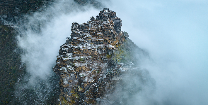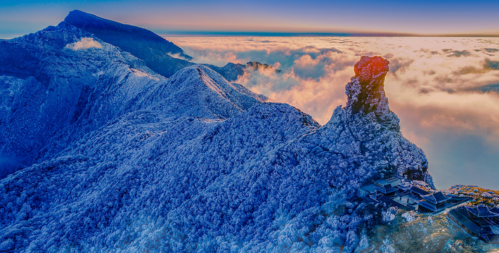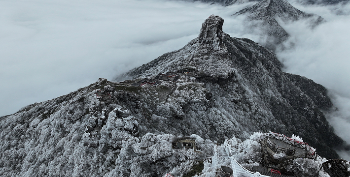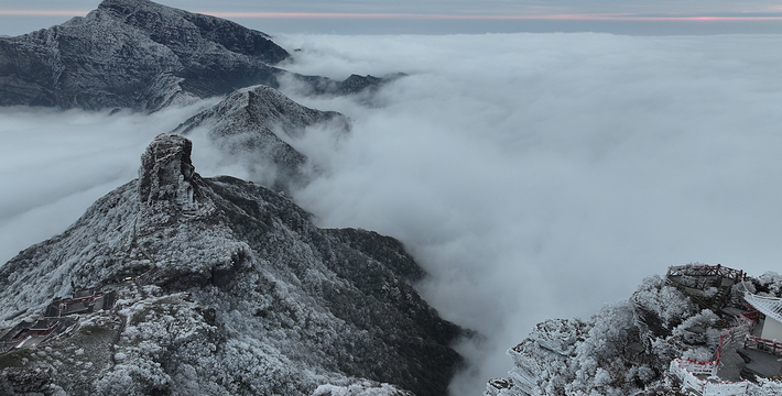 从金顶远望,白云无际,浓密处如堆积的新絮;稀疏时像薄洗的轻纱。面对此景,清人有诗云:“转眼风云相会处,凭空移步作神仙。”
