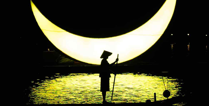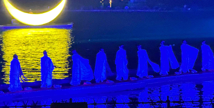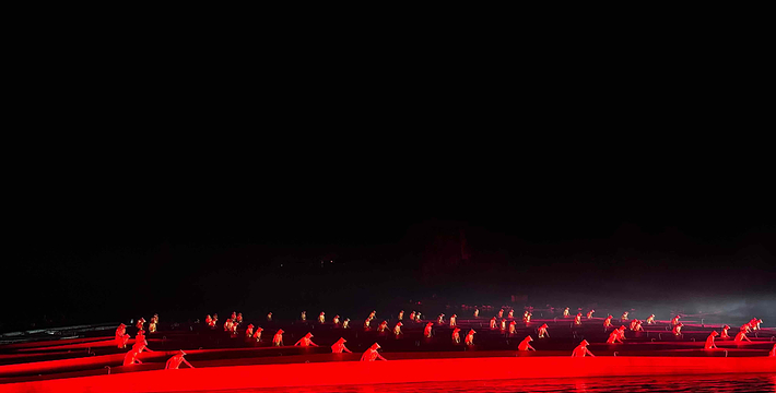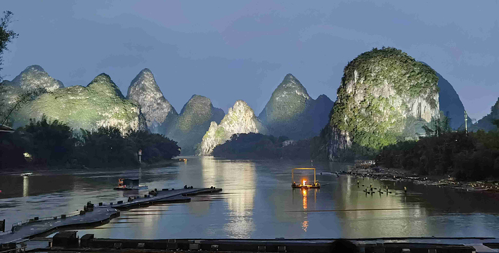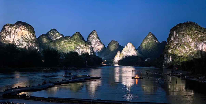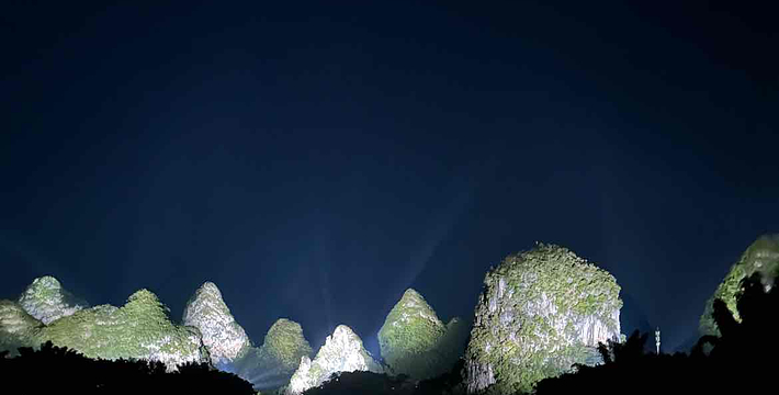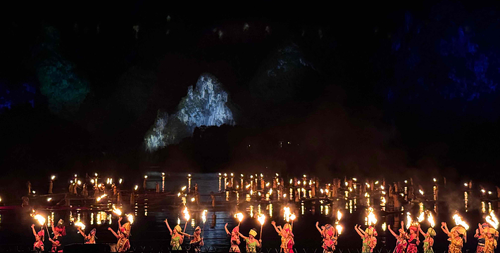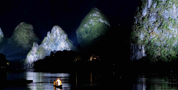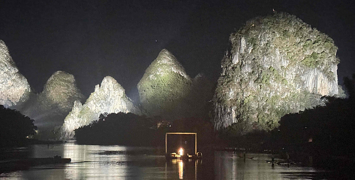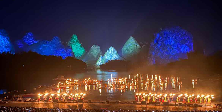 在印象·刘三姐,山峰的隐现、水镜的倒影、烟雨的点缀、竹林的轻吟、月光的披洒随时都会进入演出,成为美妙的插曲。