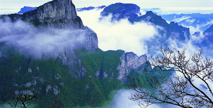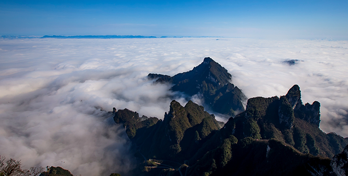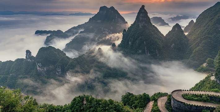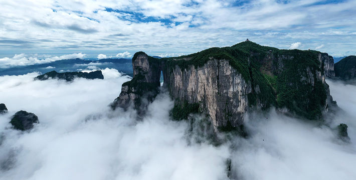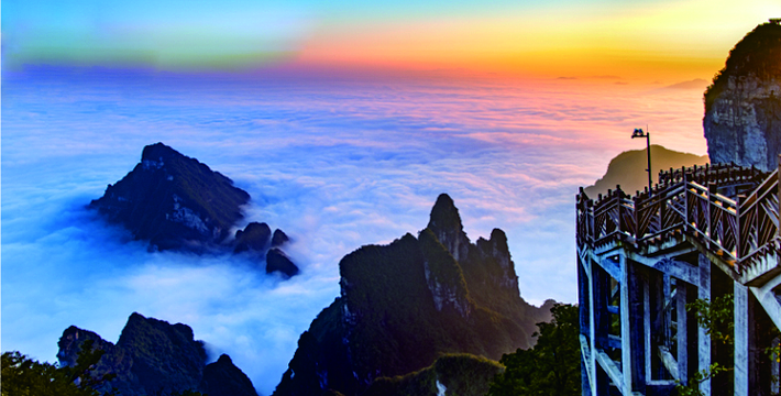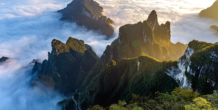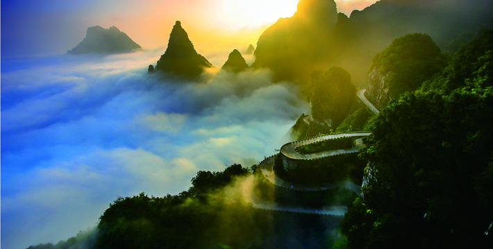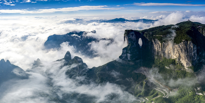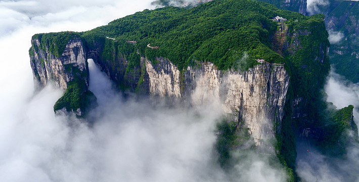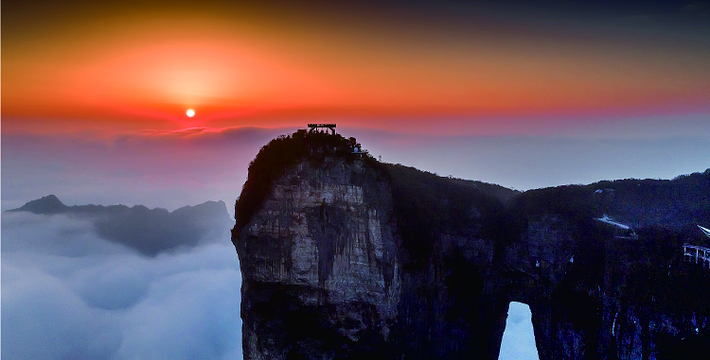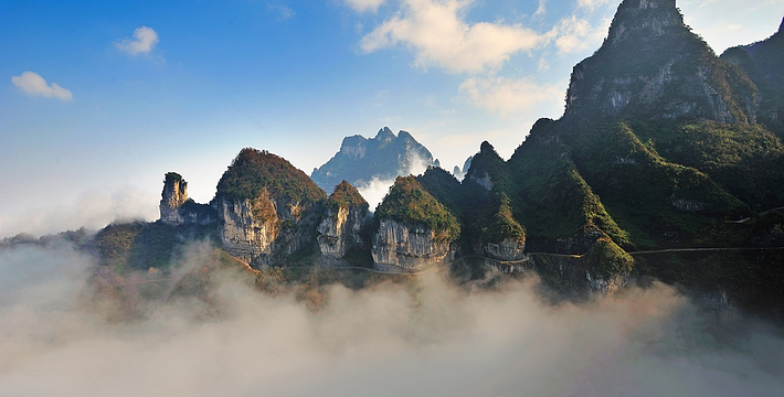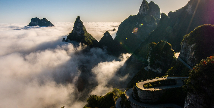 拔地擎天的天门山,山势陡险峻拔,景色雄奇壮丽,被称为张家界的天然画屏,南北对开于千寻素壁之上,气势磅礴,巍峨高绝,是罕见的高海拔穿山溶洞,更是尽显造化神奇的冠世奇观。主要有天门洞开、碧野瑶台、觅仙奇境和天界佛国景区。山顶的千年古刹天门山寺安奉有一枚珍贵的释迦牟尼佛祖舍利,香火鼎盛。天门山索道虹索龙翔,天门洞接地通天,蜿蜒99弯的通天大道扶摇盘旋,悬崖绝壁上的鬼谷栈道更是刺激震撼。