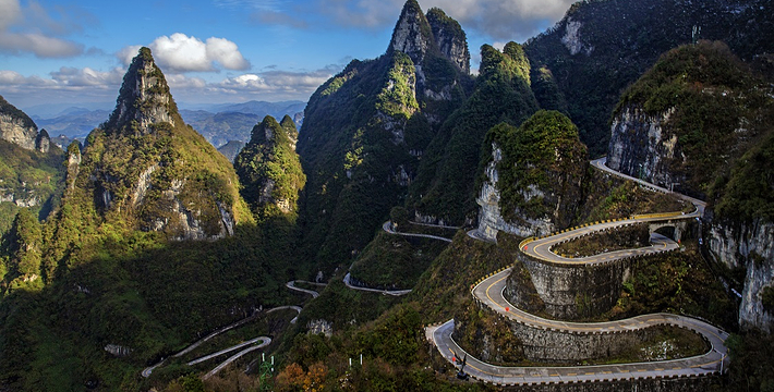 通天大道全长10.77 公里 ,但就在这么短的距离里,它的海拔却从200米急剧提升到了1300米。