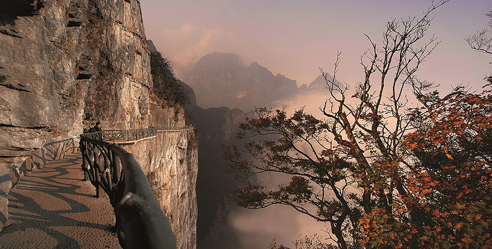 鬼谷栈道全线既不在悬崖之巅,也不在悬崖之侧,而是全线都立于万丈悬崖的中间,给人以与悬崖共起伏同屈伸的感觉。