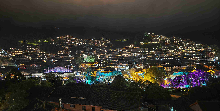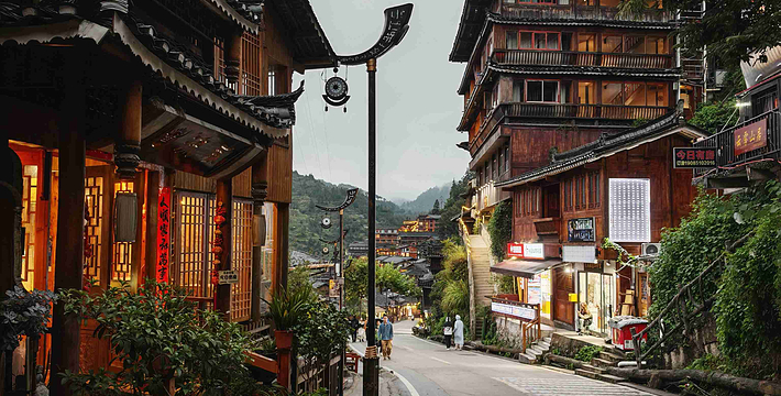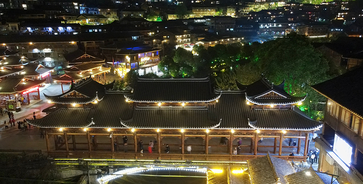 每到黄昏时分,千家万户就亮起了灯。随着天色越来越暗,西江千户苗寨变成了灯的海洋,可以看到苗寨呈现那牛头的形状。