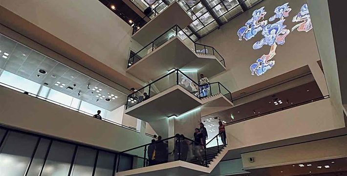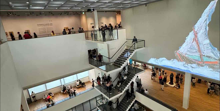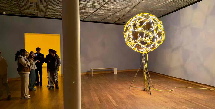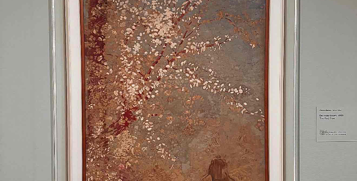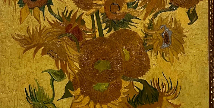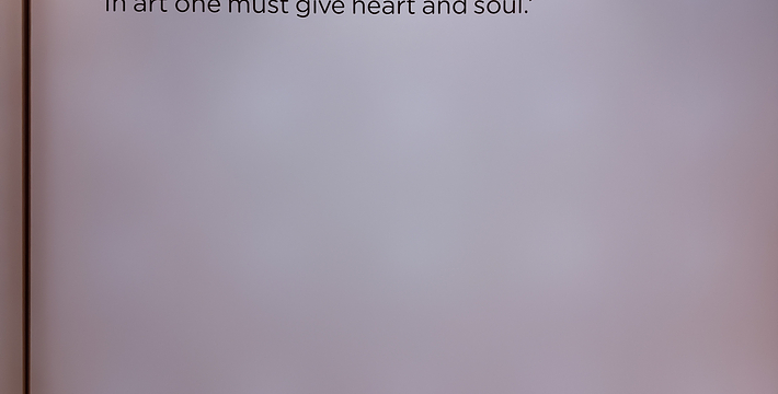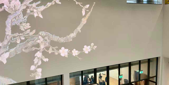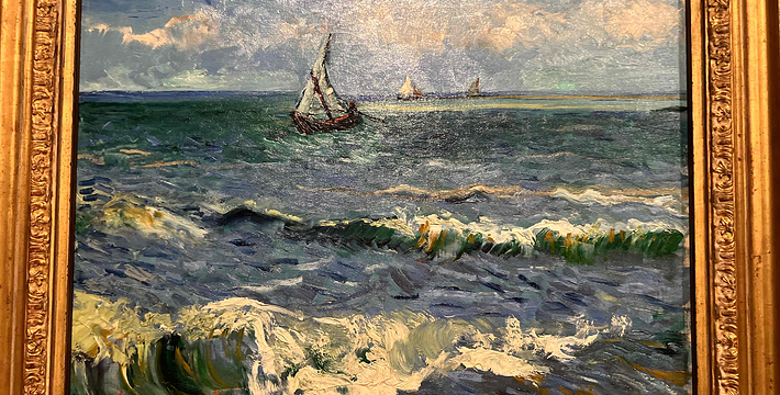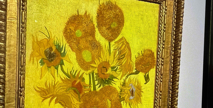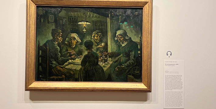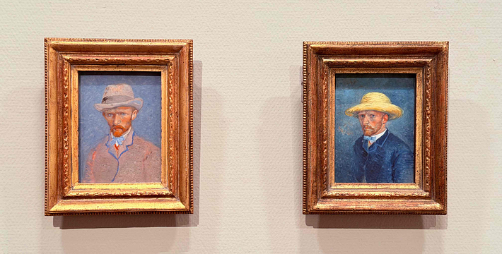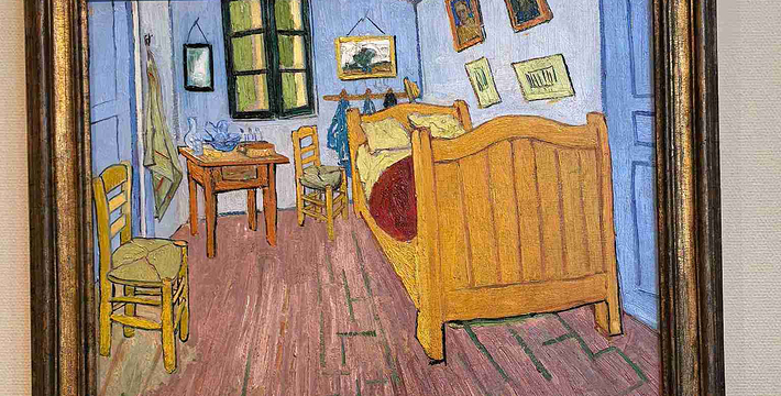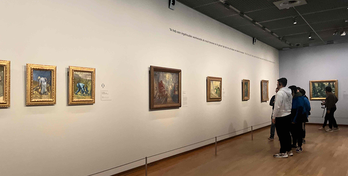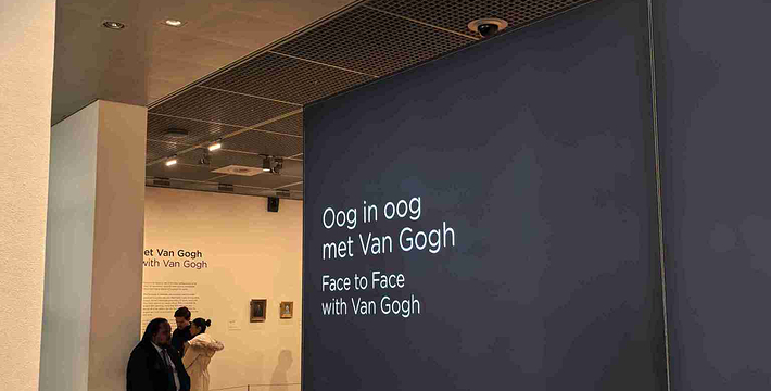 美术馆二层洁白的墙面上书写着梵高一段段坎坷的经历,一幅幅曾经见过无数次图片的真实作品依年代顺序展现在游客面前。从早期在颜色黑暗的《吃土豆的人》,到在巴黎创作的《自画像》,再到充满明亮光芒的《卧室》、《向日葵》和《丰收》,以及在圣雷米精神病院创作的《麦田收割者》,还有到他生命终结时在奥维尔创作的《麦田群鸦》,统统收藏在这里。在这里似乎听到梵高的呼吸,感受到她的心跳,完全进入梵高的世界。