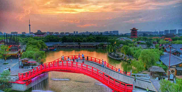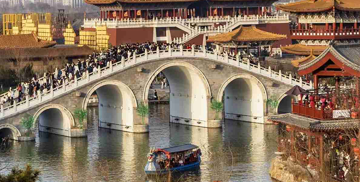 在这里你将置身于一个庞大的仿宋古建筑群中。进入园中会看到拂云阁、虹桥、水心榭、双亭桥、九龙桥等一批北宋时期开封知名的建筑,此外还有酒楼、茶肆、当铺等平民生活设施。而园中的工作人员、小商小贩们,都身穿宋朝的服饰。这些都会让你产生错觉:一脚踏入了北宋时代的东京汴梁。另外还可以带着小朋友去“趣园”、“大宋游艺”等处,玩一玩投镖、射箭爬绳、钻圈等,体验一下宋朝游戏的乐趣。