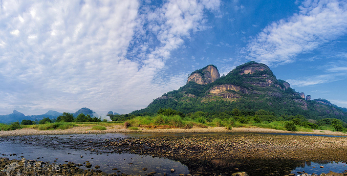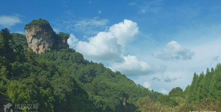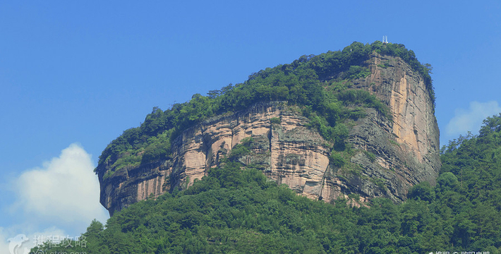 大王峰,又名魏王峰、纱帽岩,雄踞在九曲溪一曲溪北。它拔山而立,屹然高耸。大王峰高数百仞,顶大腰细,四壁陡峭,南壁有一条登峰的孔道。这是一条直上直下的裂缝,游人登峰攀梯而上,惊险而有趣。大王峰有大王亭、悟心门、张仙岩、天鉴池、通天台和投龙洞等多处胜景。特别是石门石壁上的“居高思危”四个摩崖石刻大字显赫入目,令人触景生情,浮想连翩,极富人生哲理。登上绝顶,四周山光水色尽收眼底。《大王与玉女》的传说,更是给大王峰平添了许多悲壮而神奇的色泽。度假区与大王峰仅一溪之隔。