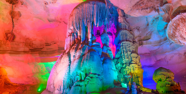 遍布精美的钟乳石群,若物若人,惟妙惟肖;天洞宏大绮丽,曲折幽深,景观奇异。