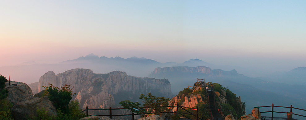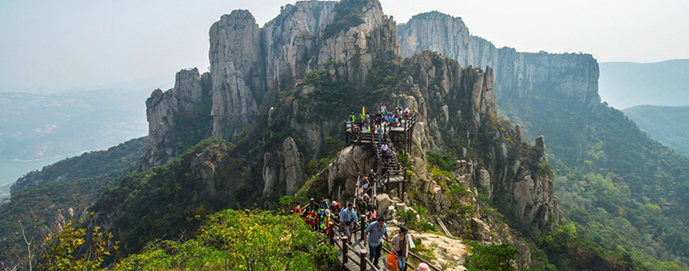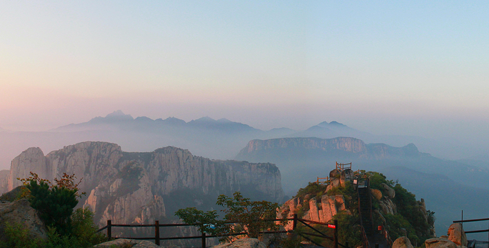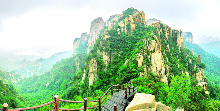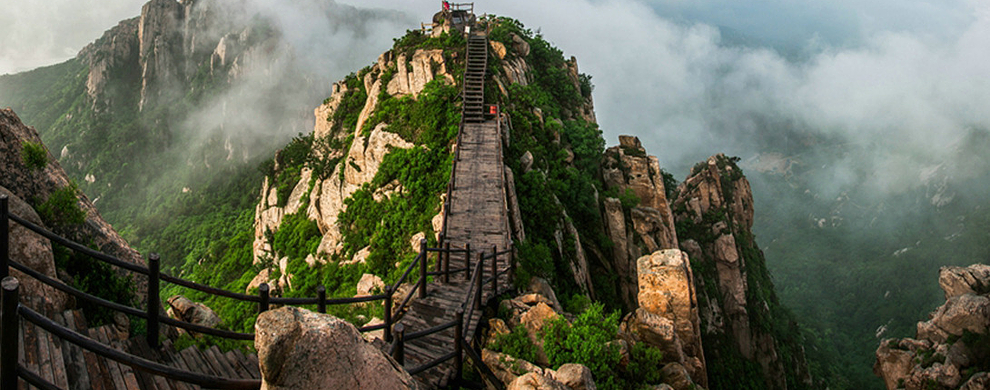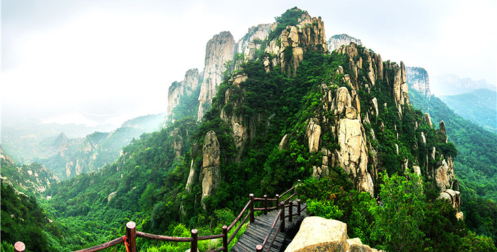 天崮山的千米木栈道也是一道奇观,它宛若一道天梯盘桓于主景区山际之间,气势恢宏,古朴壮观。