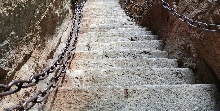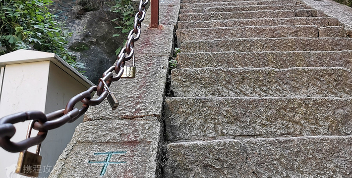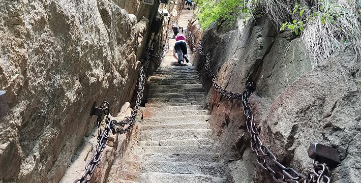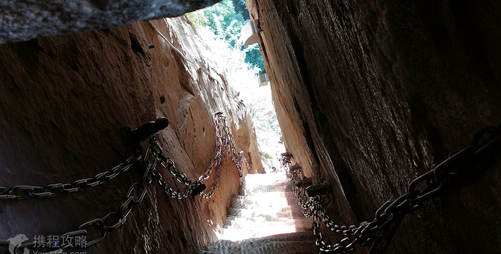 千尺幢在华山峪回心石上,是华山著名险道之一,也是华山峪登主峰的必经之道。这里原为一崖间裂,宽仅三尺,直立70度,后来人们沿隙凿拓成路,有石阶370级。阶宽仅可容半足,游人登临,仰视一线天开,俯视若临深井,故又名天井,原幢口置有铁盖,盖上则可完全封闭路径,幢壁“太华咽喉”石刻是其真实写照。