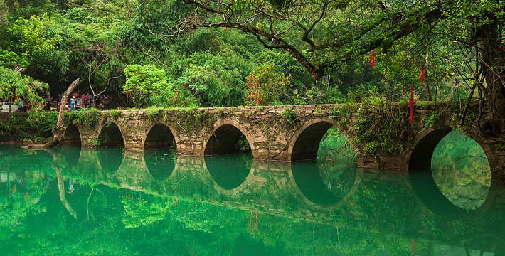 响水河上有一座古桥,这就是著名的小七孔桥。此景区的得名亦因此桥。此桥建于清代道光十五年,(公元1835年)桥下七孔,横跨响水河。