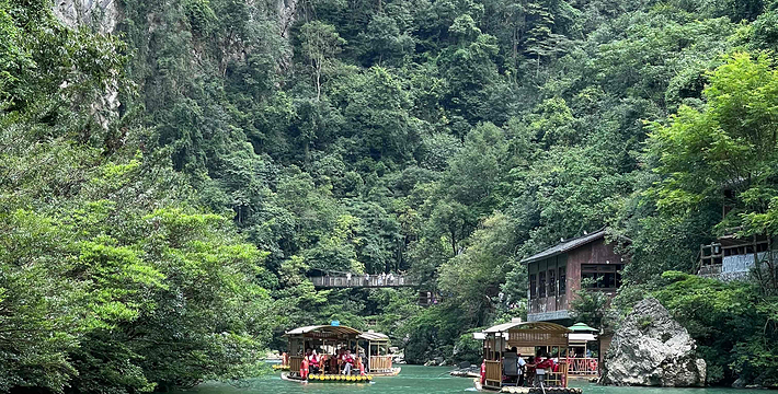 水上森林,长约600米,分上下两段。河谷里丛生着茂密的乔木和灌木,形成一道翡翠屏障,可谓是“水在石上淌,树在水中长”的奇景。