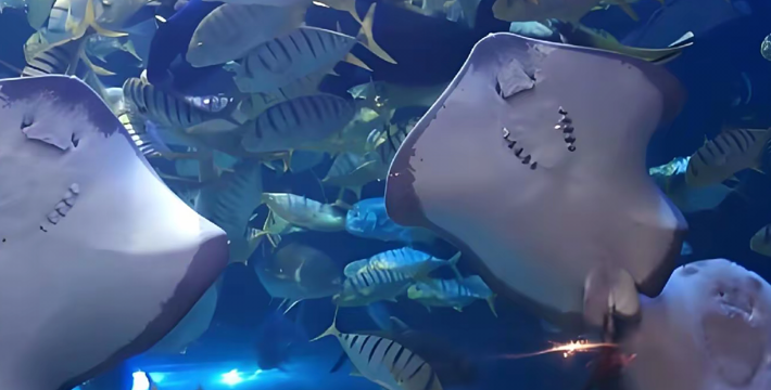 通过透明的拱形长廊,海底隧道创造了一种“人在内、鱼在外”的观赏方式,270度的观赏视窗让游客仿佛置身于美妙的大海中,千余种海洋生物环绕在我们身边,触手可及。