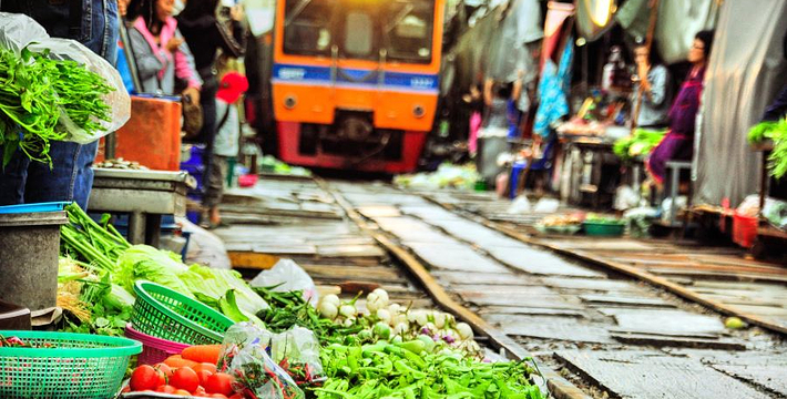 但由于有一辆通勤火车每天从菜摊之间不足2米的空隙中驶过8次,它成为泰国一个有名的市井风情胜地。菜贩们在这里出售当地特产的水果,如荔枝、榴莲、芒果和新鲜的海产品、干辣椒等。顾客们则在各个摊位之间穿行,挑选自己每日下锅的菜品。来自世界各国的游客们就围在卖炸青蛙等当地美食的摊位前惊奇不已。美*火车市场(MaeKlong Railway Market)又叫做美*铁道市场”,每天都有八趟火车经过生意兴隆的美*铁道市场,那情形是十分地惊险。也就是这份惊险,使得美*火车市场成为泰国一个有名的市井风情胜地,引得各国游客千里迢迢专程前来观光。