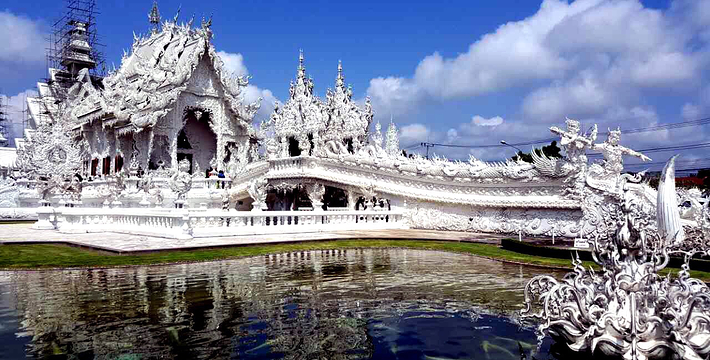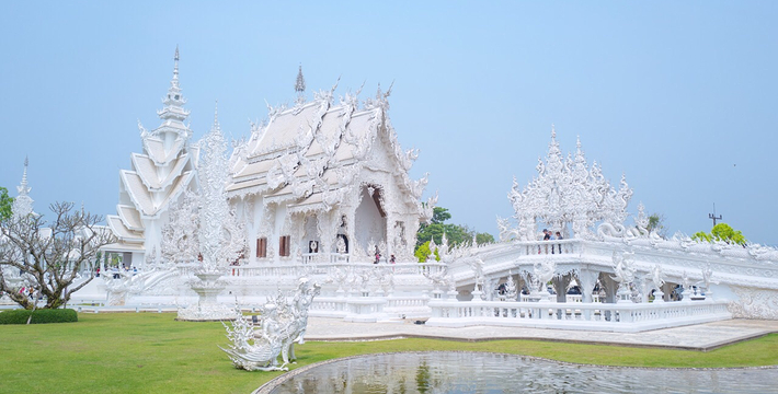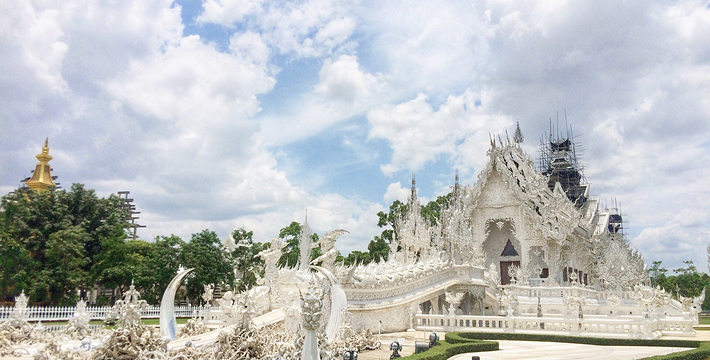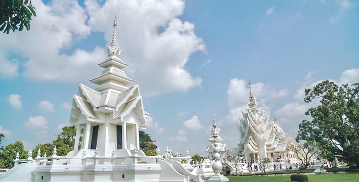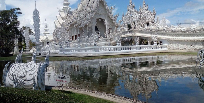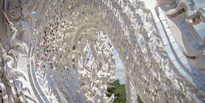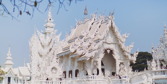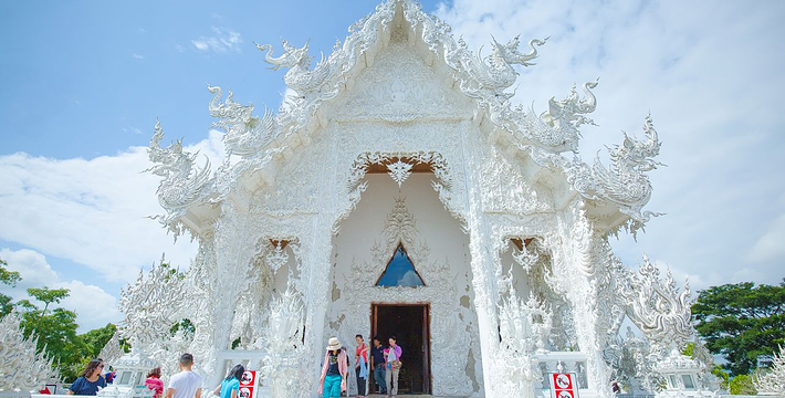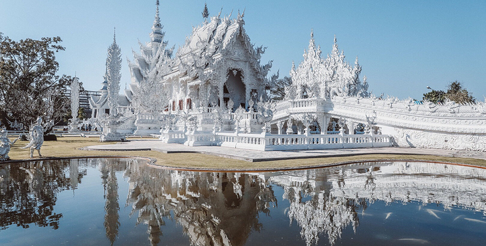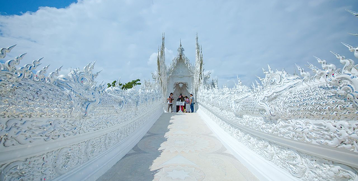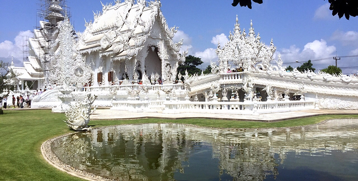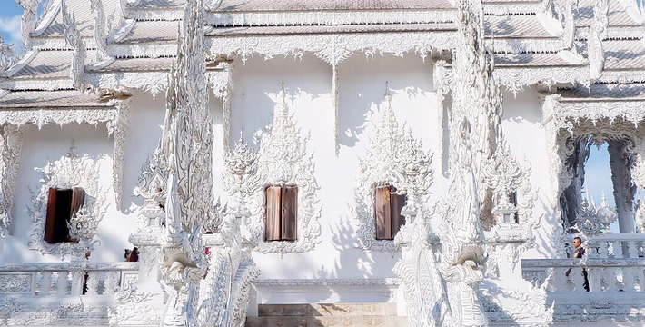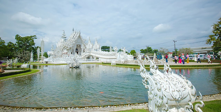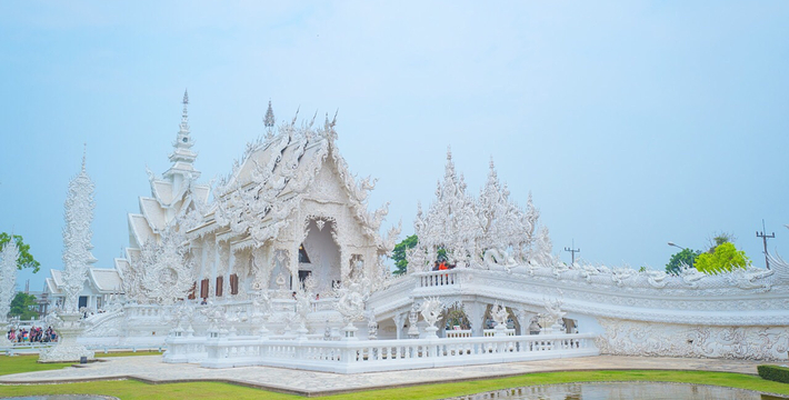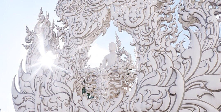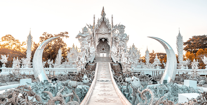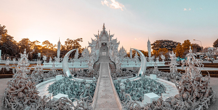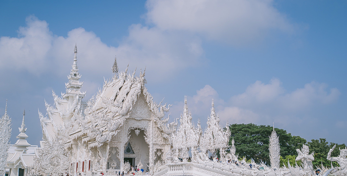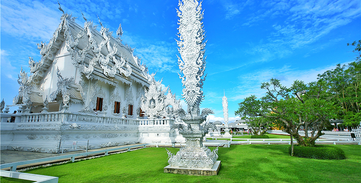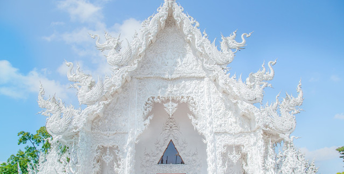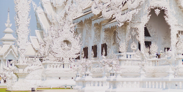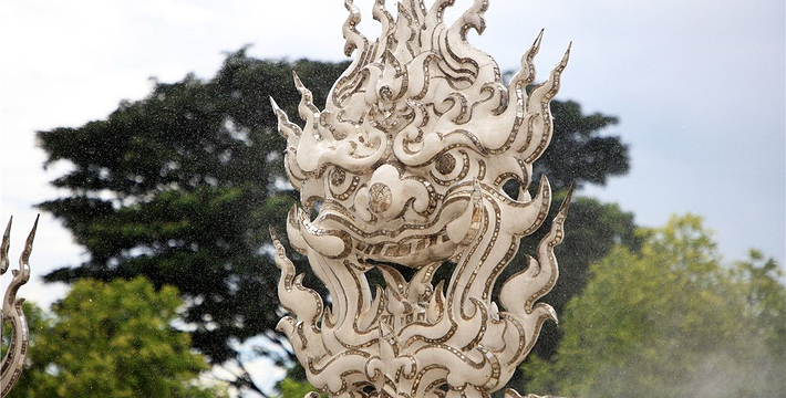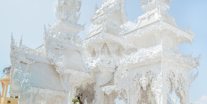 泰国清莱灵光寺(汉语为龙昆寺、灵光寺、洼龙坤、白龙寺或俗称白庙)位于泰王国清莱府,是由泰国的知名艺术CharlermchaiKositpipat出钱出力、设计建设的。这栋充满现代化风格的佛寺庙堂外部装饰着镜子的碎片,山形窗边则装饰着Nagas(多头蛇和幽冥世界之神祇)以及大象和伞等形状。内部有Khositphiphat手绘的巨幅佛像壁画。这些建筑、用雕塑诠释了佛教的含义、佛教的精华、佛教的智慧。除了佛教,还看到了其他宗教的影子和人物,表现出佛教的包容与博大。白庙不收门票。在开放的时间可以自由进入,但庙内不许拍照。