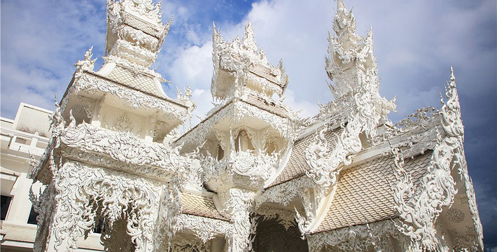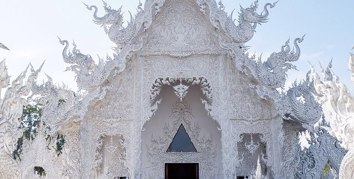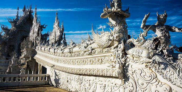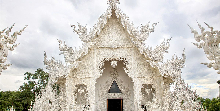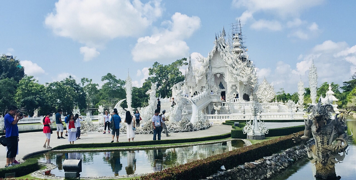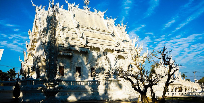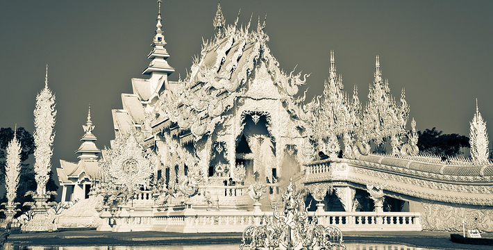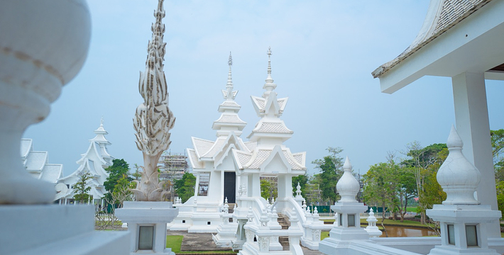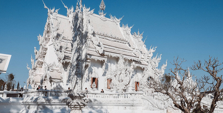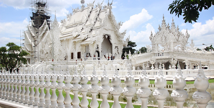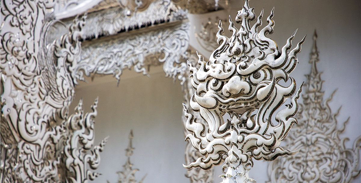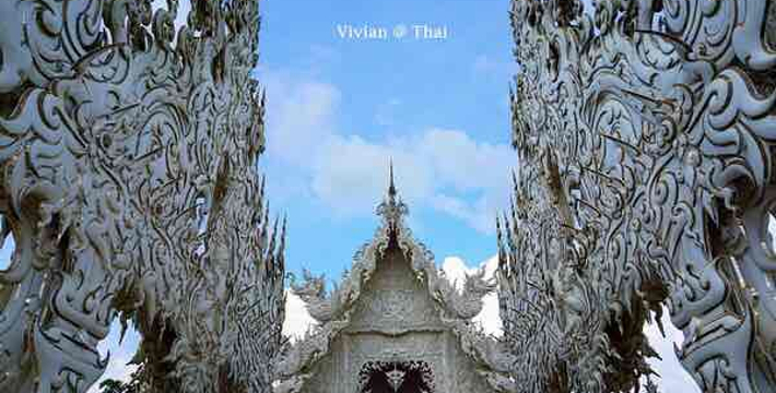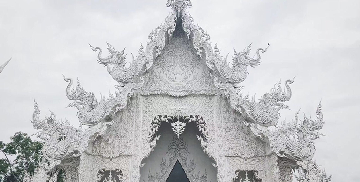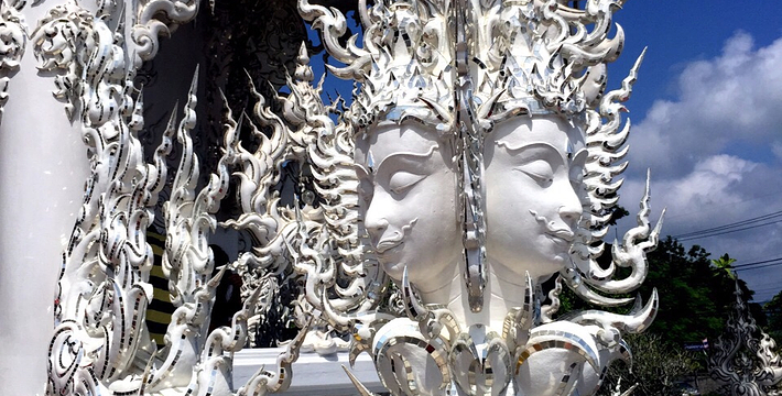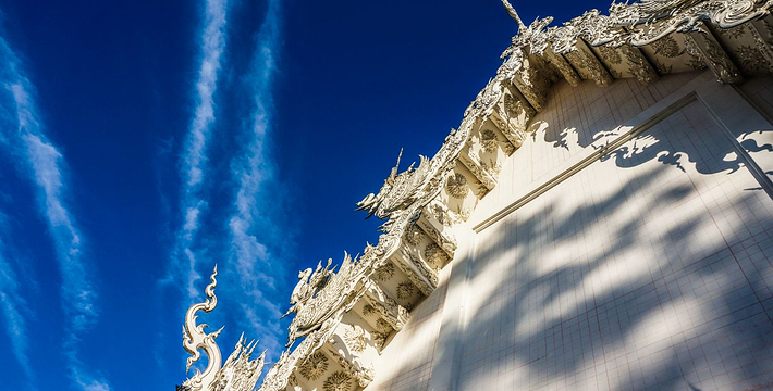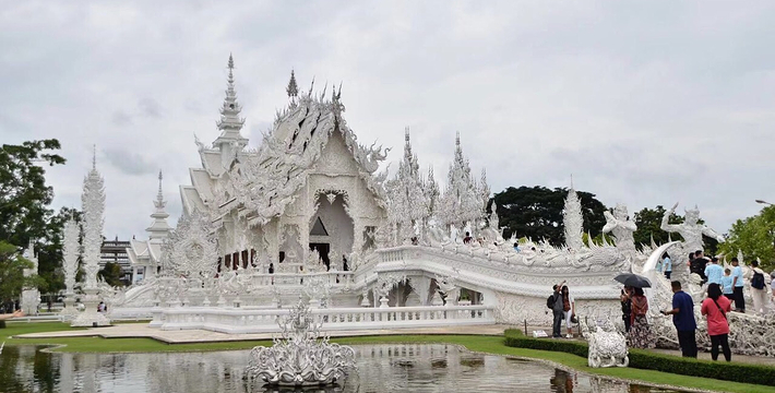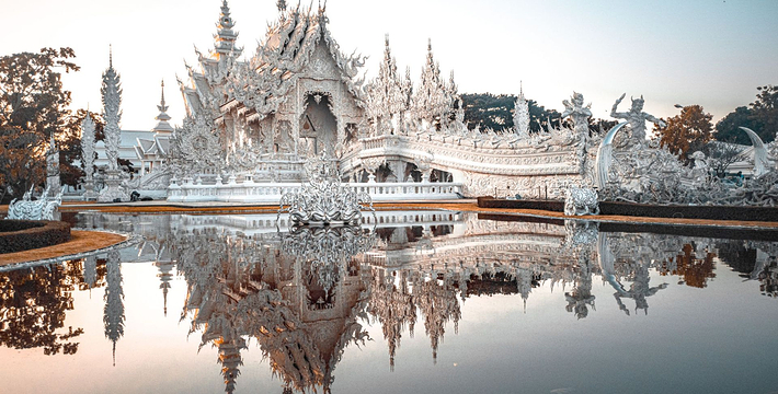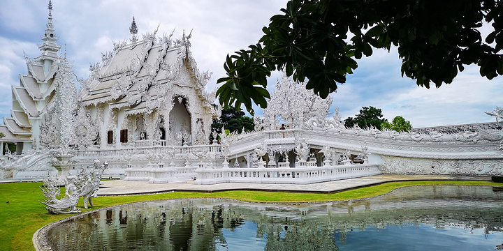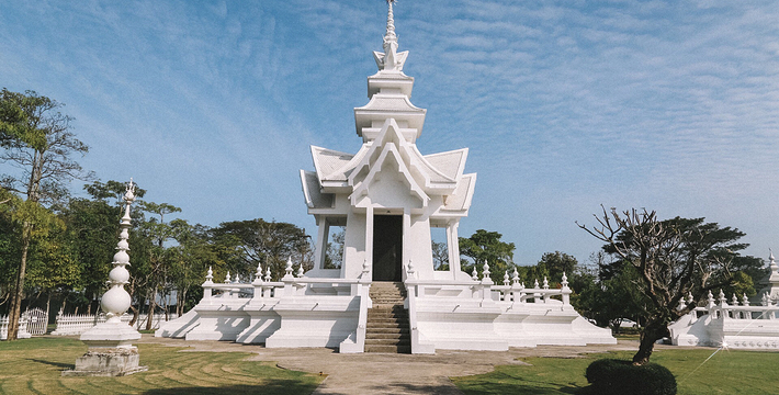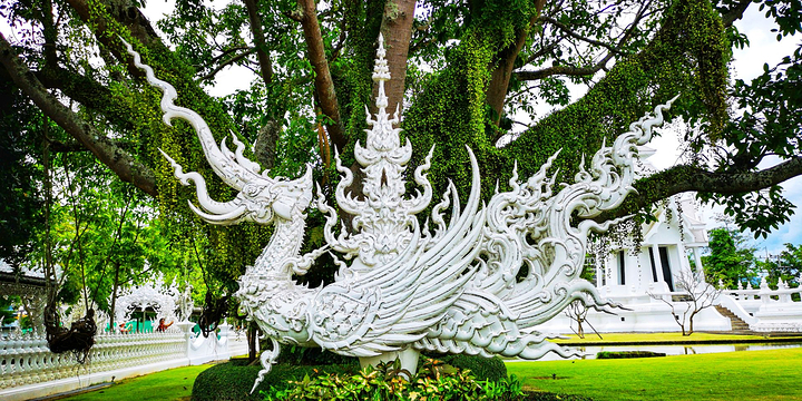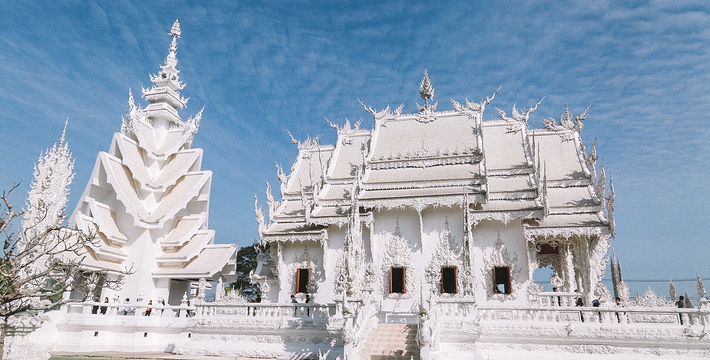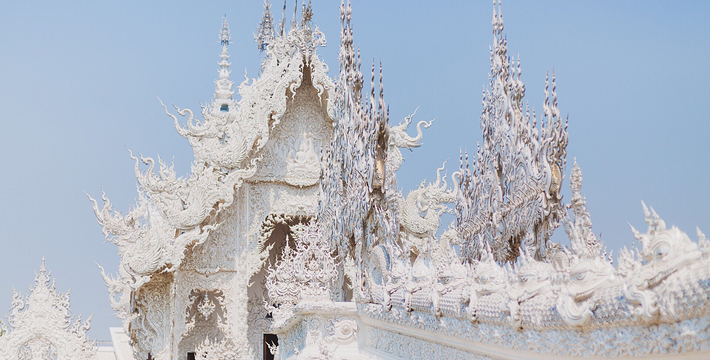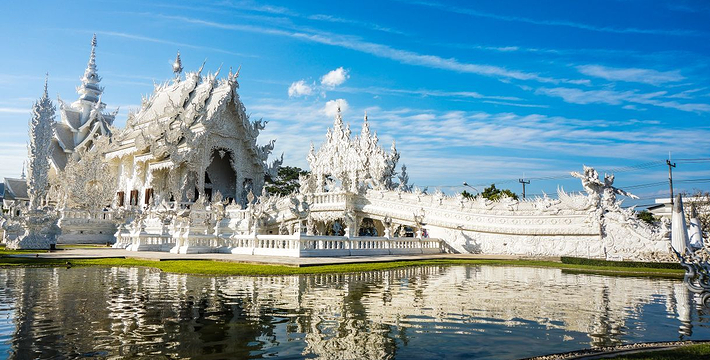 泰国清莱灵光寺(汉语为龙昆寺、灵光寺、洼龙坤、白龙寺或俗称白庙)位于泰王国清莱府,是由泰国的知名艺术CharlermchaiKositpipat出钱出力、设计建设的。这栋充满现代化风格的佛寺庙堂外部装饰着镜子的碎片,山形窗边则装饰着Nagas(多头蛇和幽冥世界之神祇)以及大象和伞等形状。内部有Khositphiphat手绘的巨幅佛像壁画。这些建筑、用雕塑诠释了佛教的含义、佛教的精华、佛教的智慧。除了佛教,还看到了其他宗教的影子和人物,表现出佛教的包容与博大。白庙不收门票。在开放的时间可以自由进入,但庙内不许拍照。