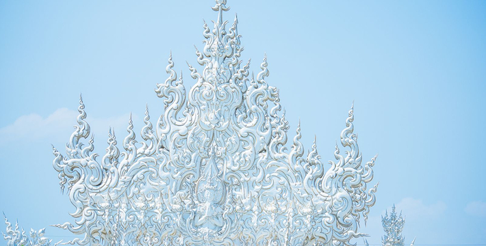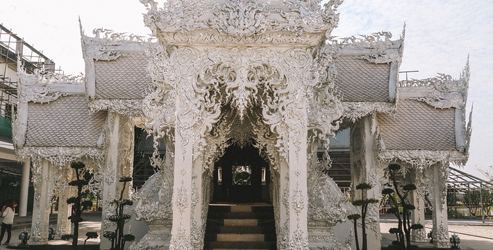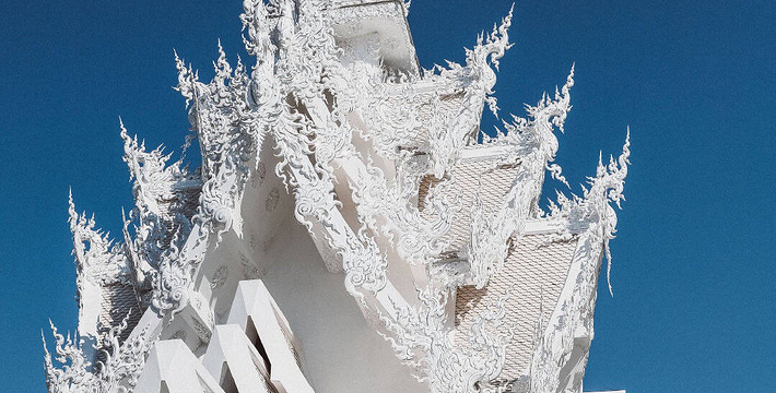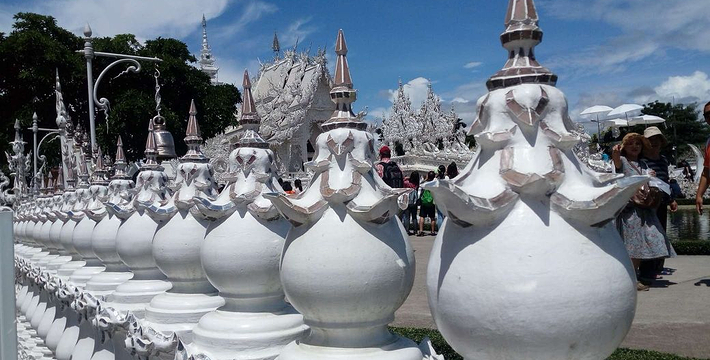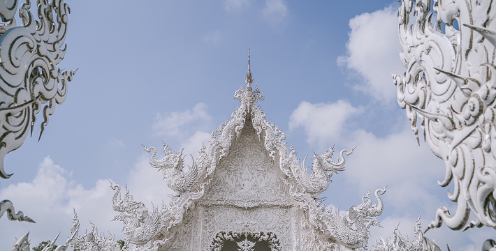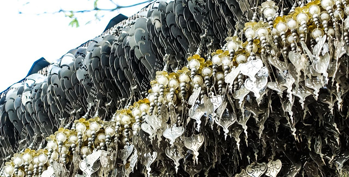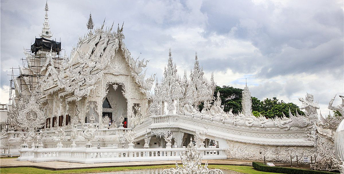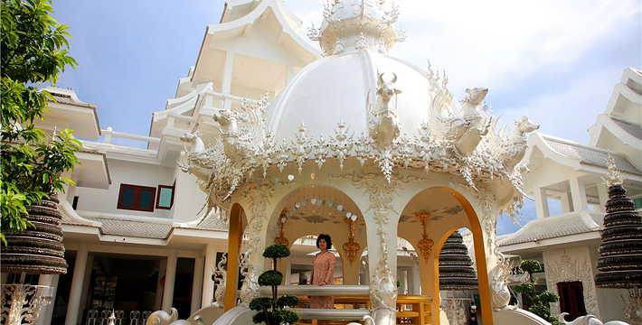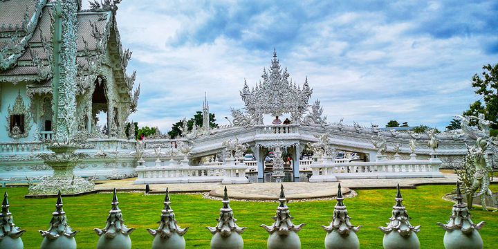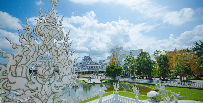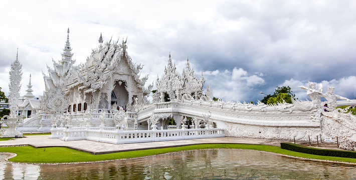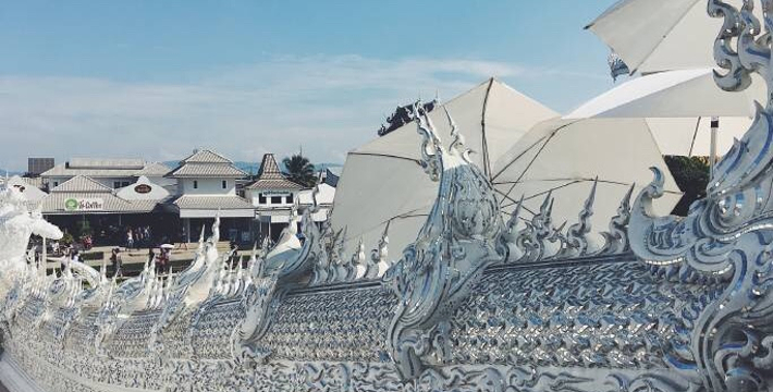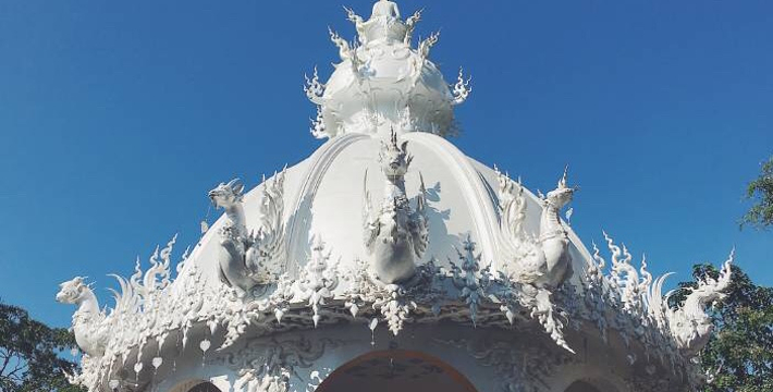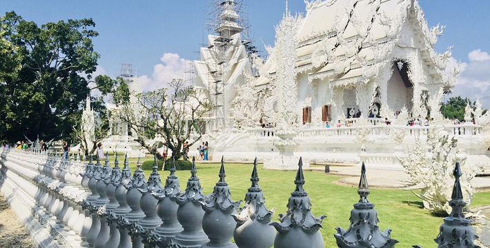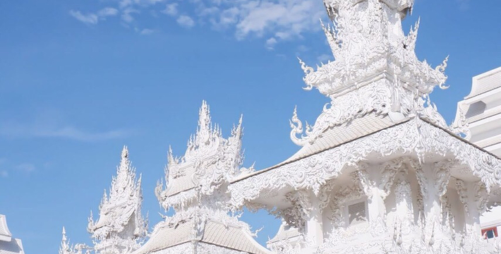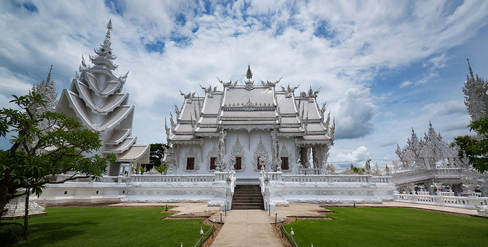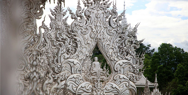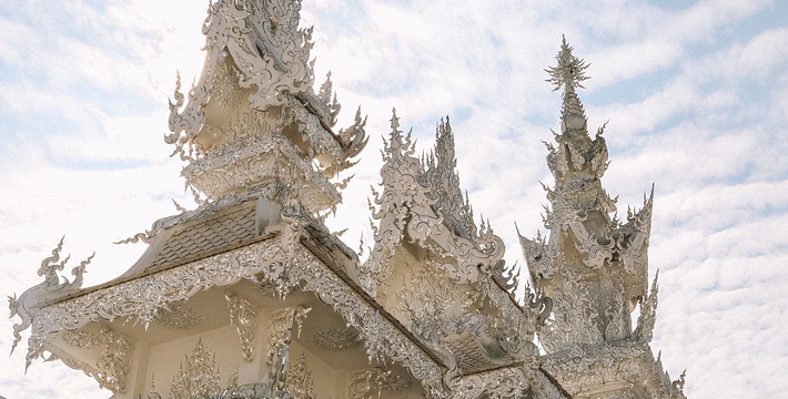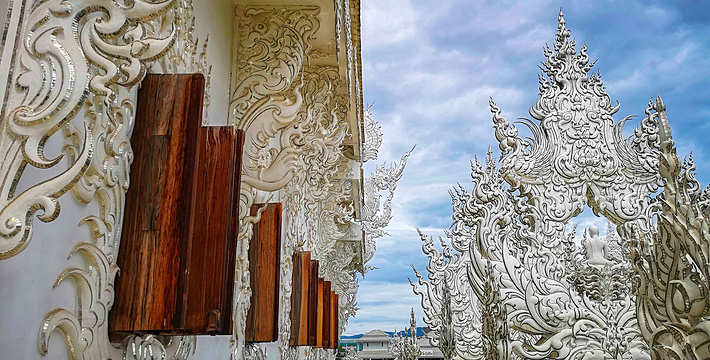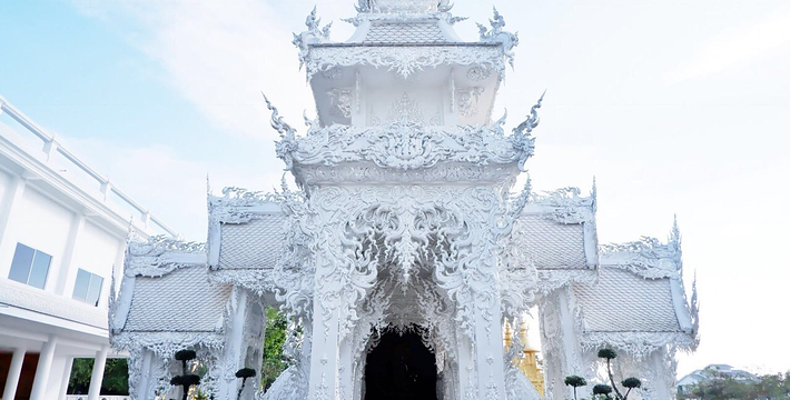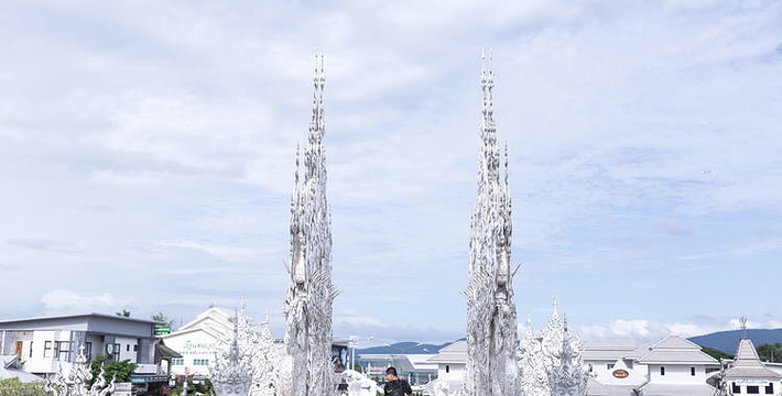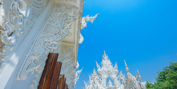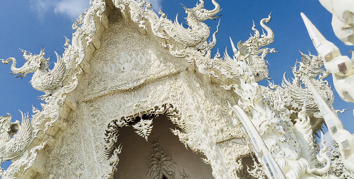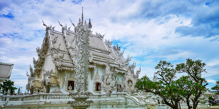 泰国清莱灵光寺(汉语为龙昆寺、灵光寺、洼龙坤、白龙寺或俗称白庙)位于泰王国清莱府,是由泰国的知名艺术CharlermchaiKositpipat出钱出力、设计建设的。这栋充满现代化风格的佛寺庙堂外部装饰着镜子的碎片,山形窗边则装饰着Nagas(多头蛇和幽冥世界之神祇)以及大象和伞等形状。内部有Khositphiphat手绘的巨幅佛像壁画。这些建筑、用雕塑诠释了佛教的含义、佛教的精华、佛教的智慧。除了佛教,还看到了其他宗教的影子和人物,表现出佛教的包容与博大。白庙不收门票。在开放的时间可以自由进入,但庙内不许拍照。