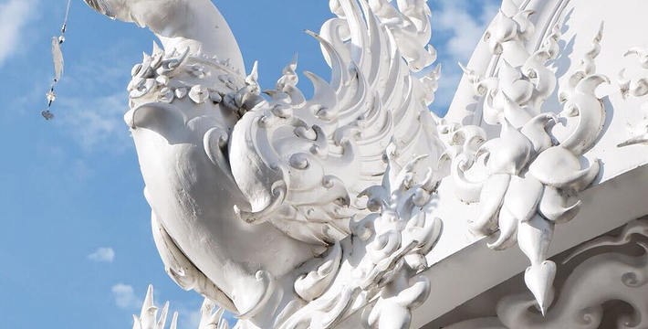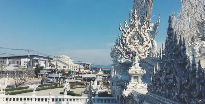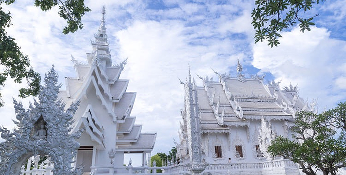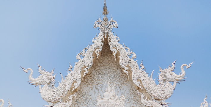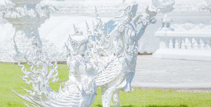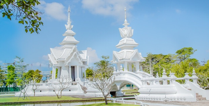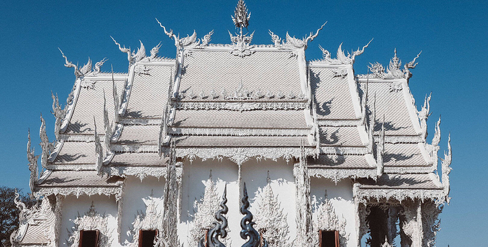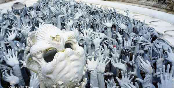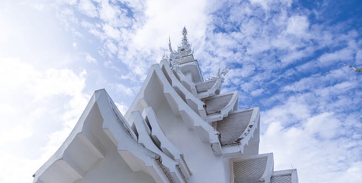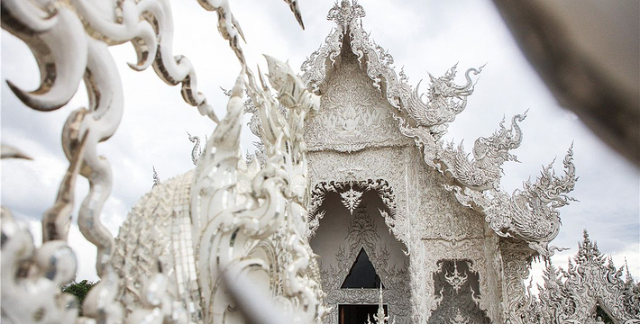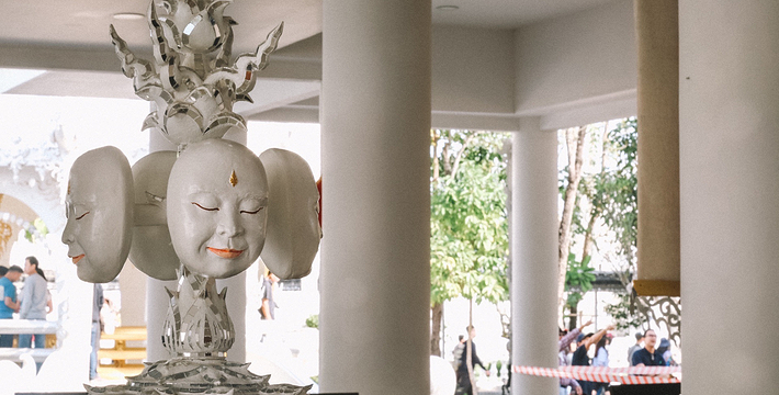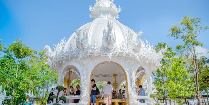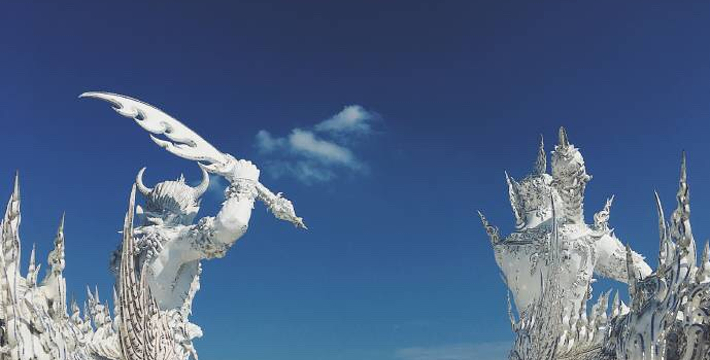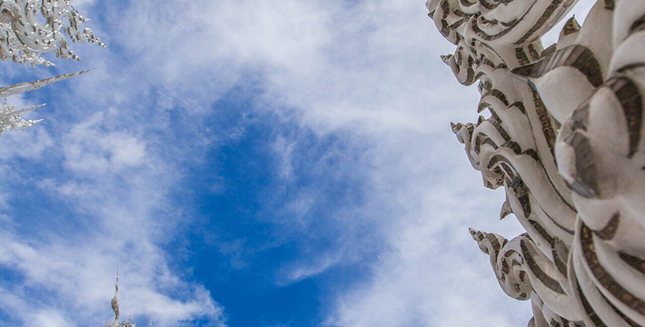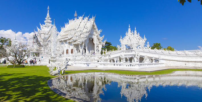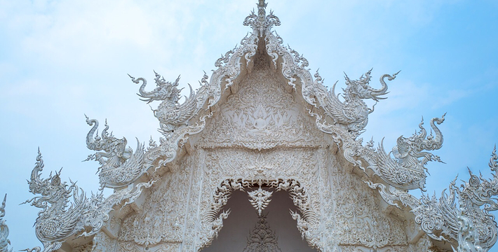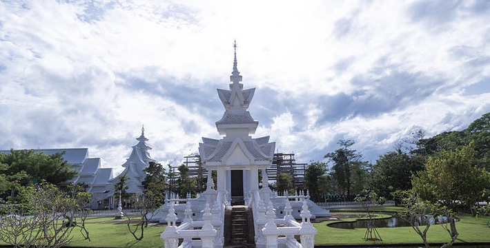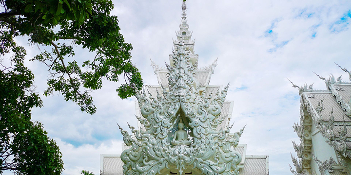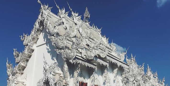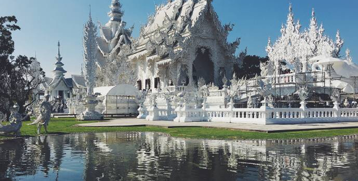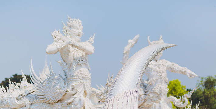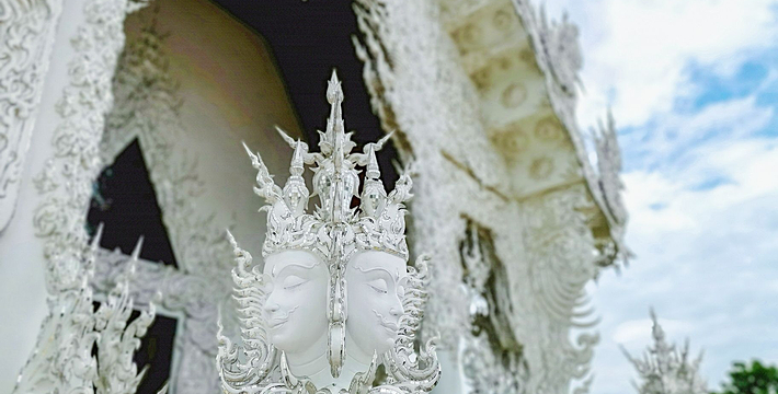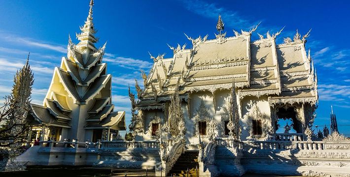 泰国清莱灵光寺(汉语为龙昆寺、灵光寺、洼龙坤、白龙寺或俗称白庙)位于泰王国清莱府,是由泰国的知名艺术CharlermchaiKositpipat出钱出力、设计建设的。这栋充满现代化风格的佛寺庙堂外部装饰着镜子的碎片,山形窗边则装饰着Nagas(多头蛇和幽冥世界之神祇)以及大象和伞等形状。内部有Khositphiphat手绘的巨幅佛像壁画。这些建筑、用雕塑诠释了佛教的含义、佛教的精华、佛教的智慧。除了佛教,还看到了其他宗教的影子和人物,表现出佛教的包容与博大。白庙不收门票。在开放的时间可以自由进入,但庙内不许拍照。