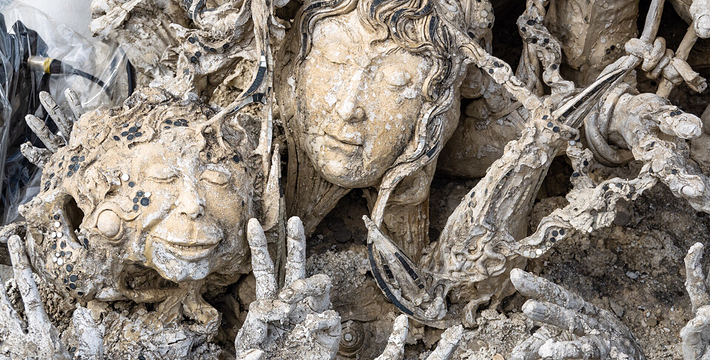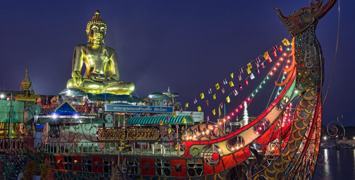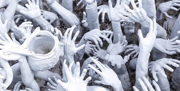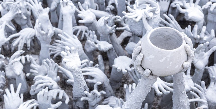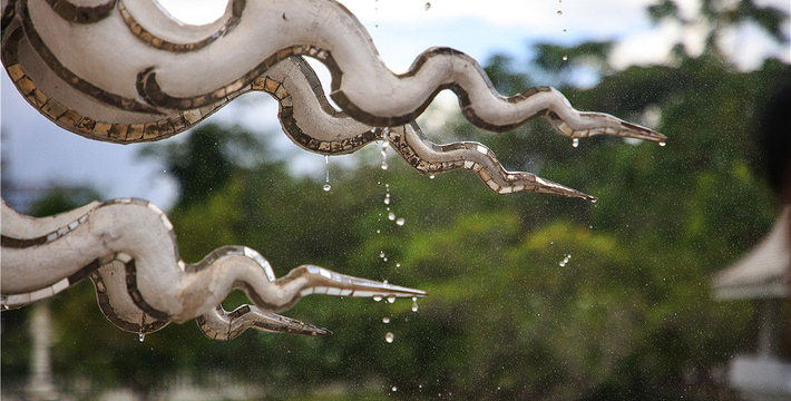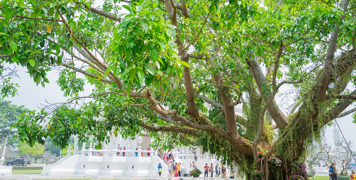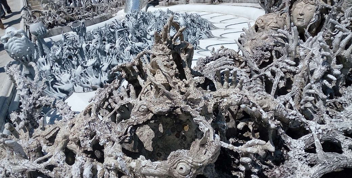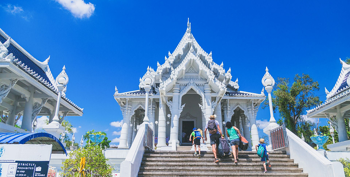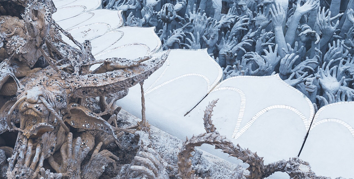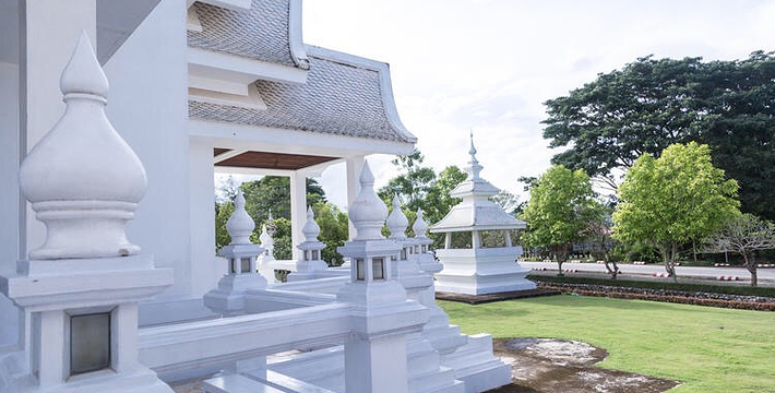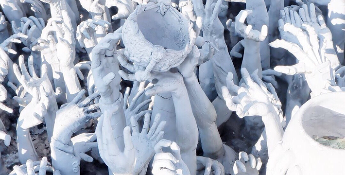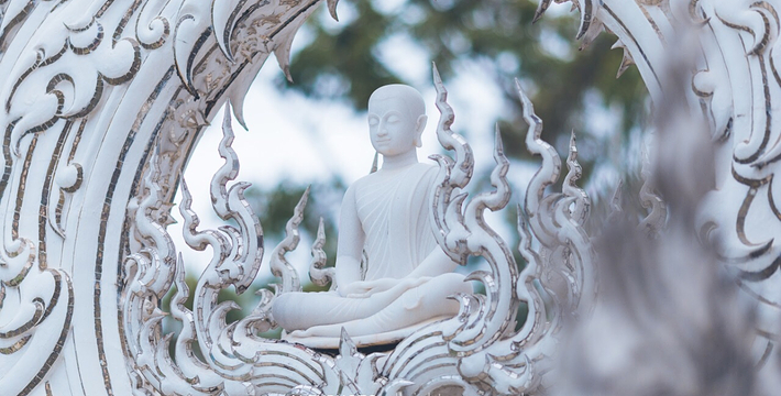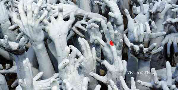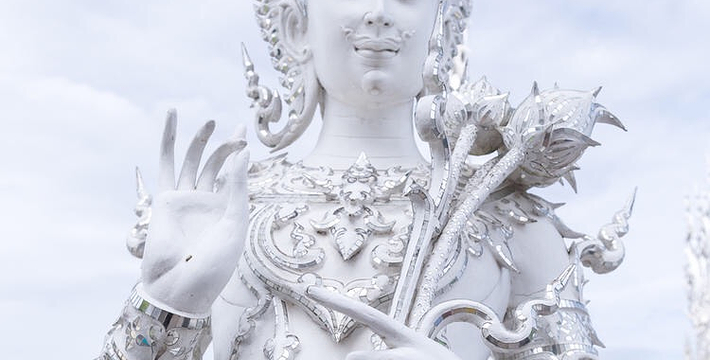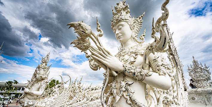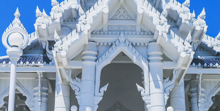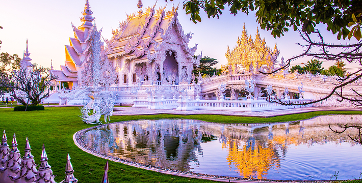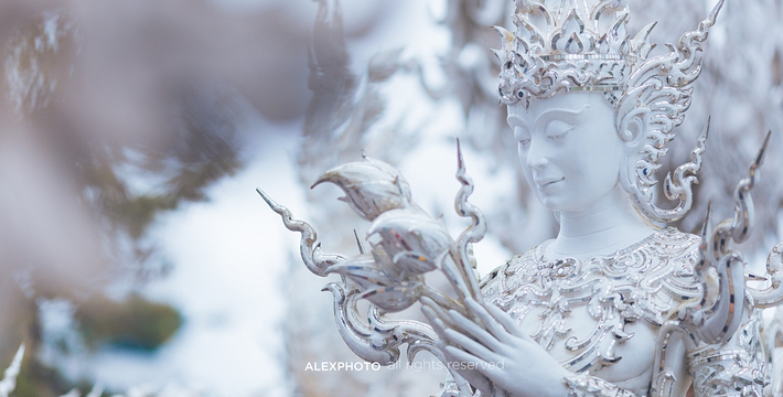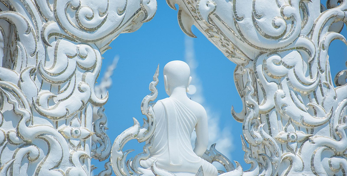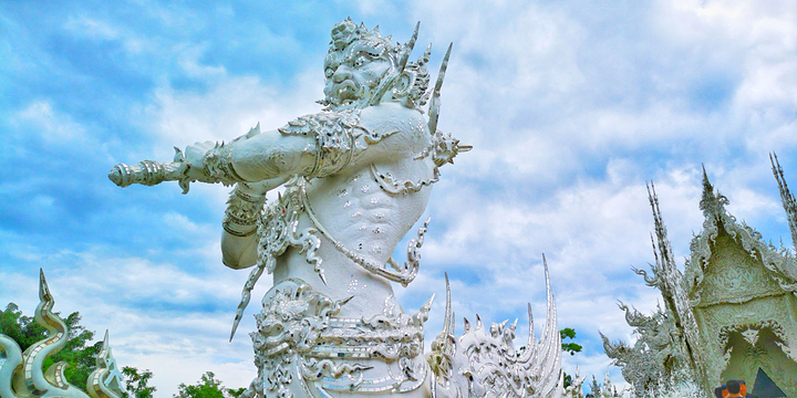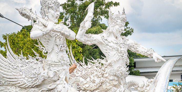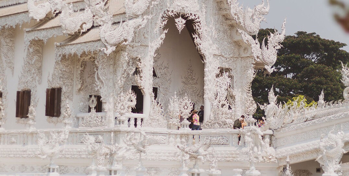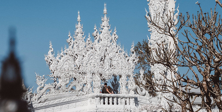 泰国清莱灵光寺(汉语为龙昆寺、灵光寺、洼龙坤、白龙寺或俗称白庙)位于泰王国清莱府,是由泰国的知名艺术CharlermchaiKositpipat出钱出力、设计建设的。这栋充满现代化风格的佛寺庙堂外部装饰着镜子的碎片,山形窗边则装饰着Nagas(多头蛇和幽冥世界之神祇)以及大象和伞等形状。内部有Khositphiphat手绘的巨幅佛像壁画。这些建筑、用雕塑诠释了佛教的含义、佛教的精华、佛教的智慧。除了佛教,还看到了其他宗教的影子和人物,表现出佛教的包容与博大。白庙不收门票。在开放的时间可以自由进入,但庙内不许拍照。