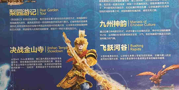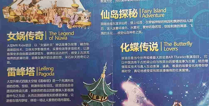华夏探险之旅 非遗小镇 → 九州神韵 → 极地快车 → 惊魂之旅 → 丛林飞龙 → 飞跃河谷 → 仙岛探秘 → 节庆广场 → UFO → 海盗船,带你呼啸夜空! 爱情传说之旅 化蝶传说 → 决战金山寺 → 节庆广场 → 七彩王国 → 双层转马 → 波浪小火车,体验爱情传奇! 亲子欢乐之旅 非遗小镇 → 化蝶传说 → 熊出没剧场 → 亲子摩天轮 → 星际战车 → 开心蛙蛙跳 → 音乐船 → 逍遥水母,温暖休闲时光!