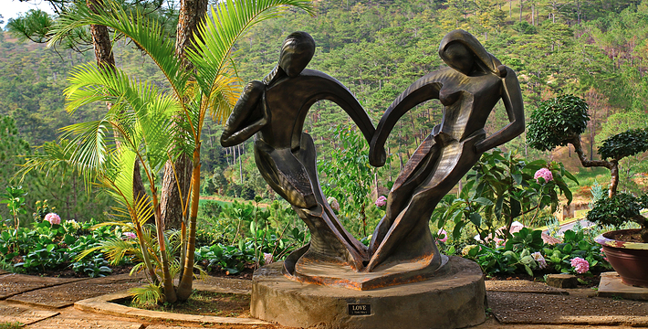 这里四周悬崖高耸,向中合抱而围成一谷。谷内大小两瀑,左边大瀑气势雄壮,落潭之音铿锵有力,有如男声;右边小瀑,曲折纤细,缓缓而下,细闻方能辨听嘤嘤婉转之音,恰似女声。两瀑相依而流,互诉衷肠,奏出鸾凤和鸣之音,默契天成,怪不得人称“情人瀑”。谷内环境幽雅,有山有水,有潭有瀑,有桥有凳,有花有树,当真是情侣幽会的绝佳之境地! 这里,正是少年大禹情窦初开之时,与一山姑幽会的秘密场所。您看这边岩壁之上,有一个半月牙形状的凹痕,正是当年两人促膝谈心时,从嫦娥那里借来月亮,镶嵌于此,以做照明之用。