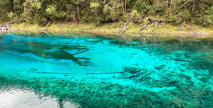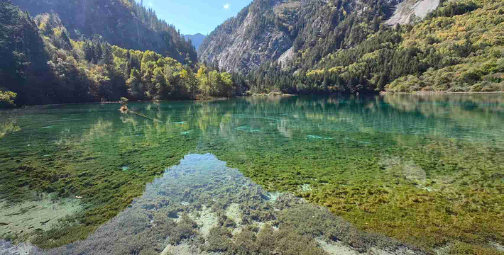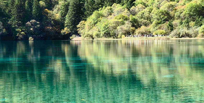 九寨沟四周群山耸峙,有雪峰数十座,高插云霄,终年白雪皑皑。河谷地带奇水荟萃,其间有成梯形分布的大小湖泊114个,瀑布群17个,钙华滩流5处,泉水47眼,湍流11段,以1870米的海拨高差,在12 座雪峰之间穿林跨谷,珠连玉接,呈Y字型串珠,逶迤近60公里、世界罕见的以高山湖泊群和瀑布群以及钙华滩流为主体的风景名胜区。湖泊小者数平方米7公里。湖水终年碧蓝澄澈,色彩斑谰,在阳光照射下,呈现出蓝、黄、橙、绿等多种色彩,绚丽夺目。天气晴朗时,蓝天、白云、雪山、森林倒映湖中,水光浮翠,美丽如画,并随季节推移呈现出不同的色彩和风韵,有“九寨归来不看水”之说。