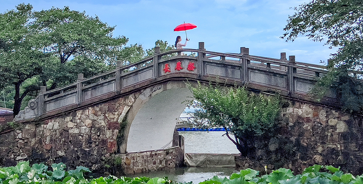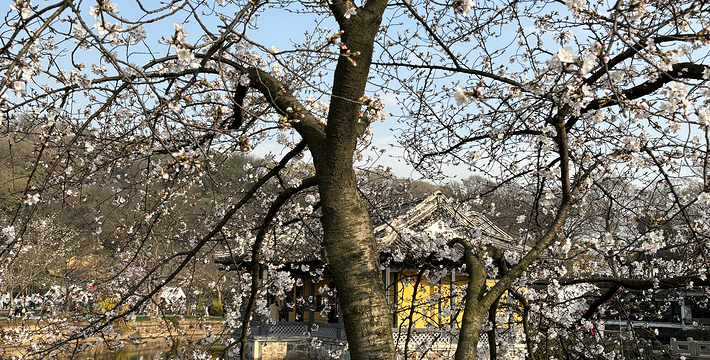 长春桥是一座拱石桥,高耸湖面,堤岸遍植樱花,挡住了外湖的景色,分隔了水面和空间,丰富了景色层次,它与涵万轩、绛雪轩和东面山坡自成一个空间,构成长春花漪的景色。