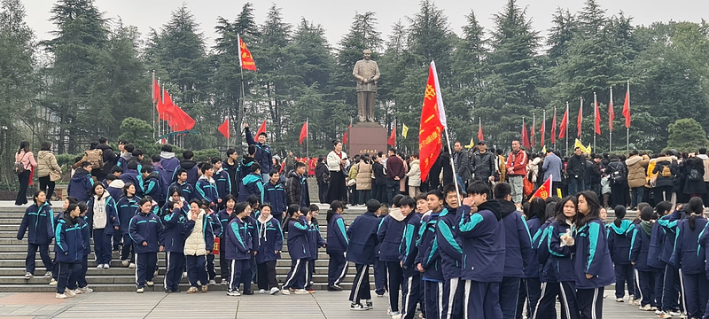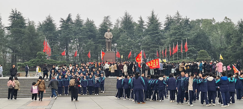 毛泽东铜像重3.7吨,像高6米,基座高4.1米,通高10.1米,象征着“10.1”国庆,更象征着毛泽东是新中国的缔造者。像面朝东南方,身着中山装,左胸前挂着“主席”证,手执文稿,目光炯炯,面带微笑,正视前方,巍然挺立,成*地再现了*毛泽东出席开国大典时的风采。