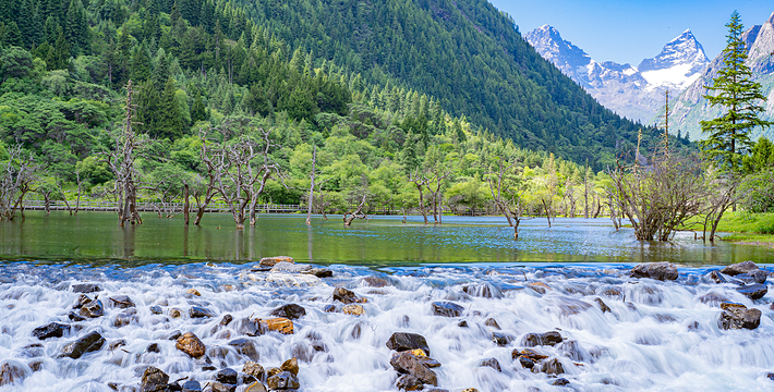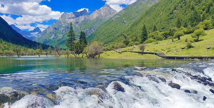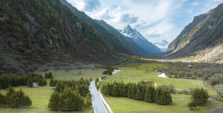双桥沟,全长34.8公里,面积约为216.6平方公里,景区分三段,已开发20几个景点,可观看到十几座海拨4000多米以上的雪山下段为杨柳桥,有阴阳谷、白杨林带、日月宝镜山、五色山等奇景。中段为撵鱼坝,包括人参果坪、沙棘林、尖山子、九架海等景点。上段为牛棚子草坪和长河滩,内有阿妣山、猎人峰、血筑墙垣、械松逸彩、牛棚子、长河坝等景点。其中古猿峰、猎人峰、鹰喙岩、金鸡岭这些大自然鬼斧神工创造出来的奇崖,让人惊骇不已;五色山、望月峰、舍心岩、色情谷这些充满神奇传说的山石,显露着独有的灵性。景区主要以雪峰、牧场、草地、森林等为主。