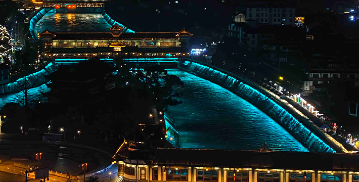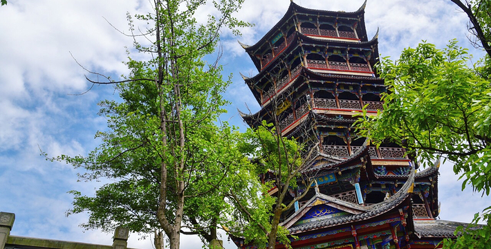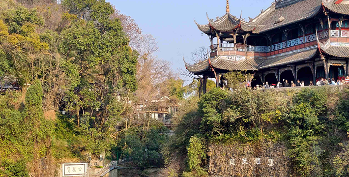 清馨玉垒山,悠久茶马道。陡峭电扶梯,万象玉垒阁。
